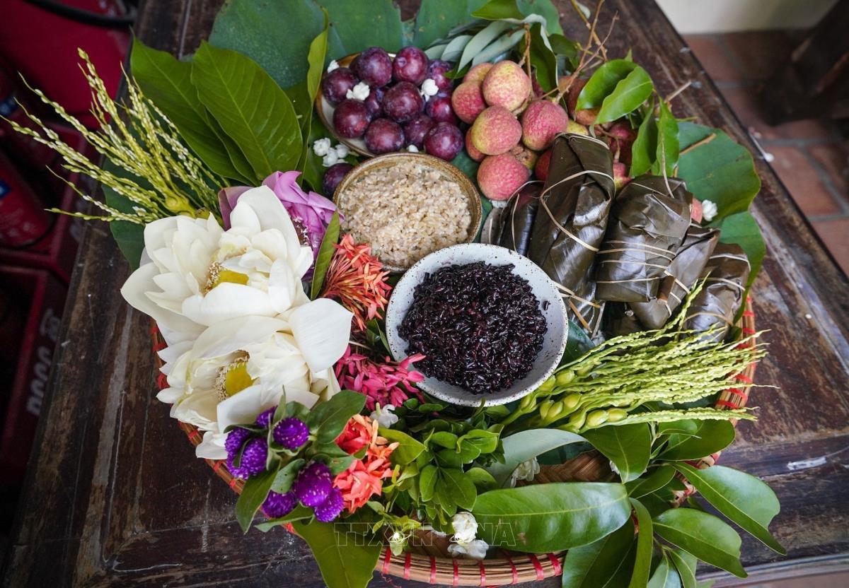 Mâm cúng Tết Đoan Ngọ là cách con cháu thể hiện lòng hiếu thảo và biết ơn. Tùy theo phong tục từng vùng miền mà mâm cúng có thể khác nhau. Mâm cúng thường được chuẩn bị tươm tất và dâng lên bàn thờ vào giờ Ngọ (khoảng 11h-1h chiều). Ảnh: Khánh Hoà – TTXVN