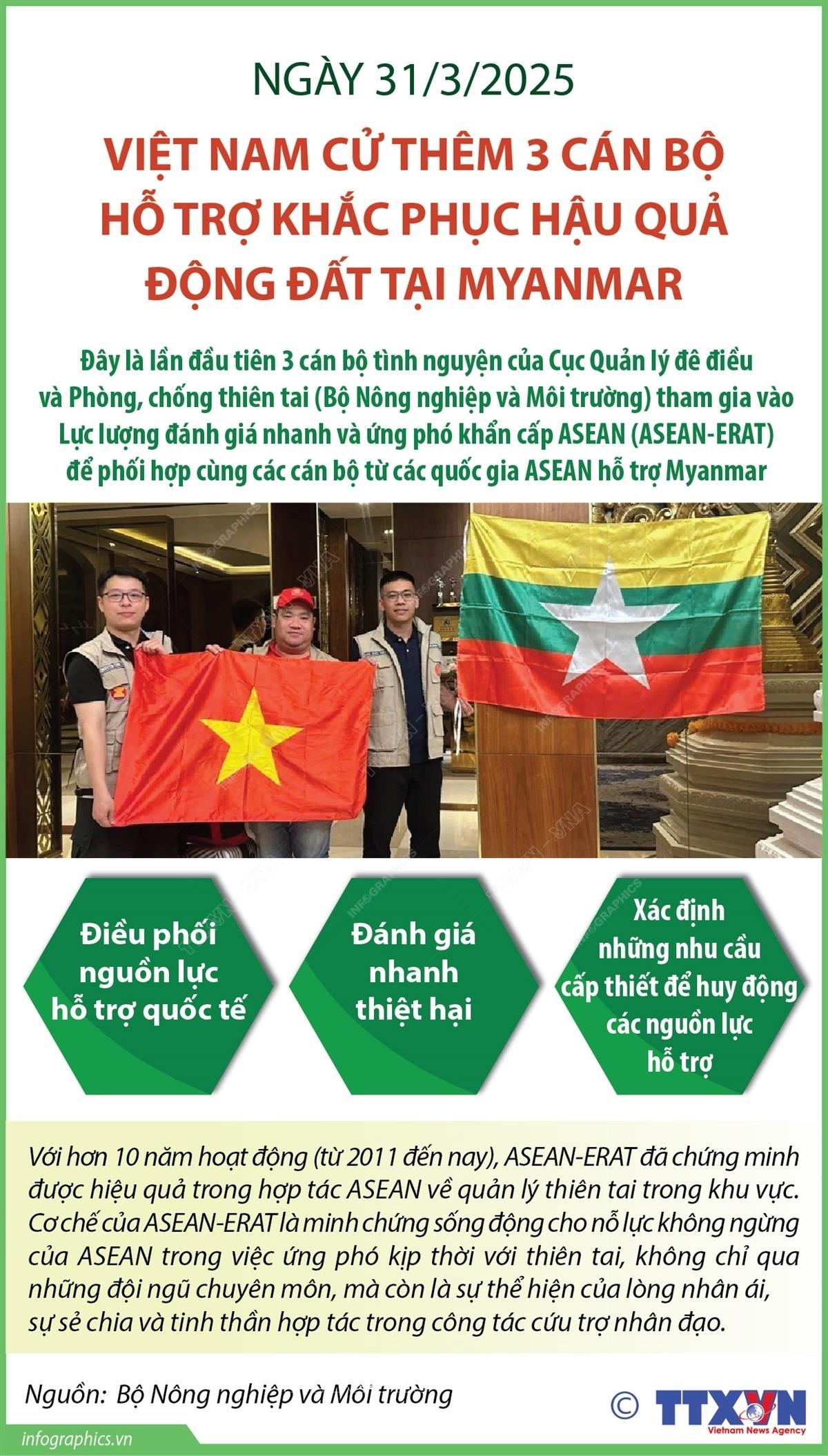 [Infographics] Ngày 31/3/2025: Việt Nam cử thêm 3 cán bộ hỗ trợ khắc phục hậu quả động đất tại Myanmar