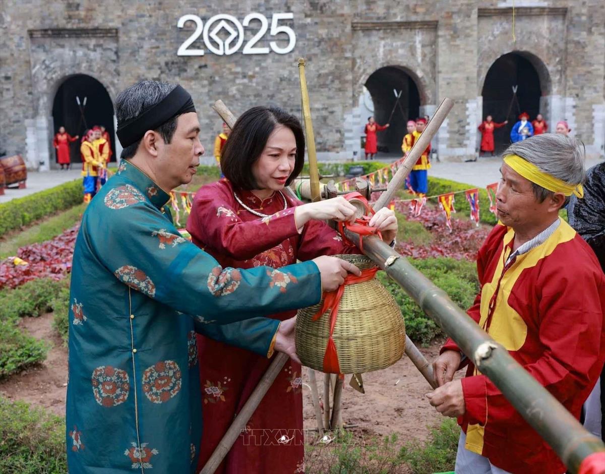 Phó Chủ tịch UBND thành phố Hà Nội Vũ Thu Hà cùng thực hiện nghi lễ dựng cây nêu (22/1/2025). Ảnh: Thanh Tùng - TTXVN