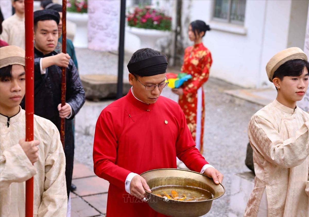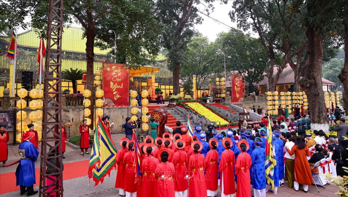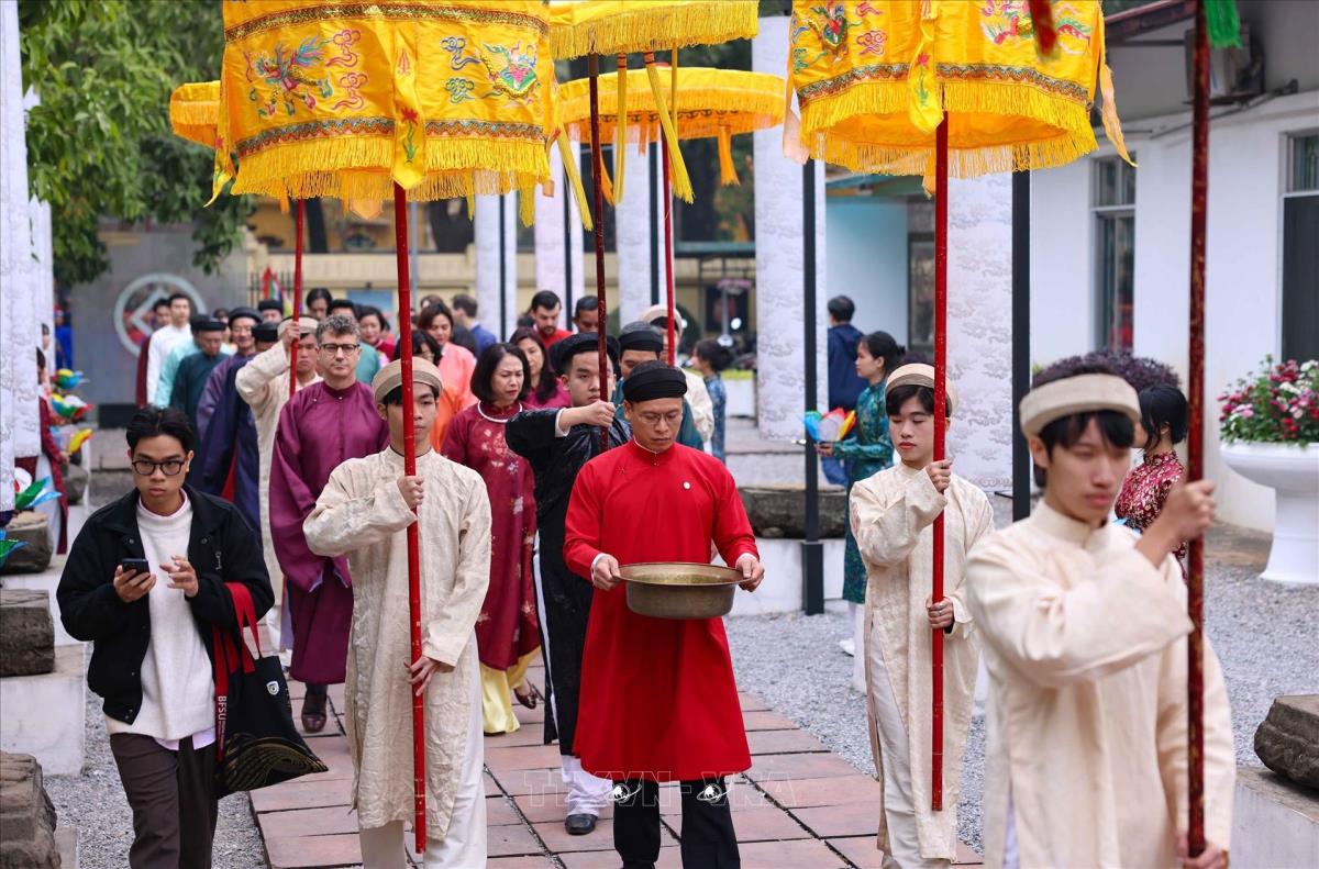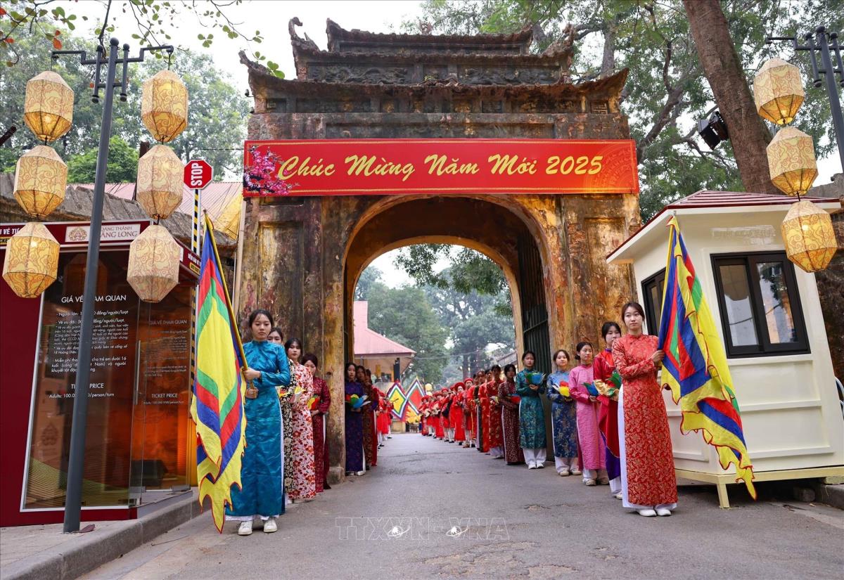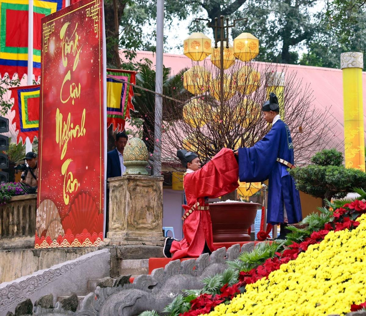 Chương trình thể nghiệm những lễ nghi trong dịp tết Nguyên đán đã từng diễn ra trong cung đình Thăng Long xưa, thể hiện mong muốn hưng thịnh cho quốc gia, sự bình an no ấm cho nhân dân (22/1/2025). Ảnh: Thanh Tùng - TTXVN