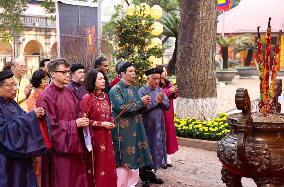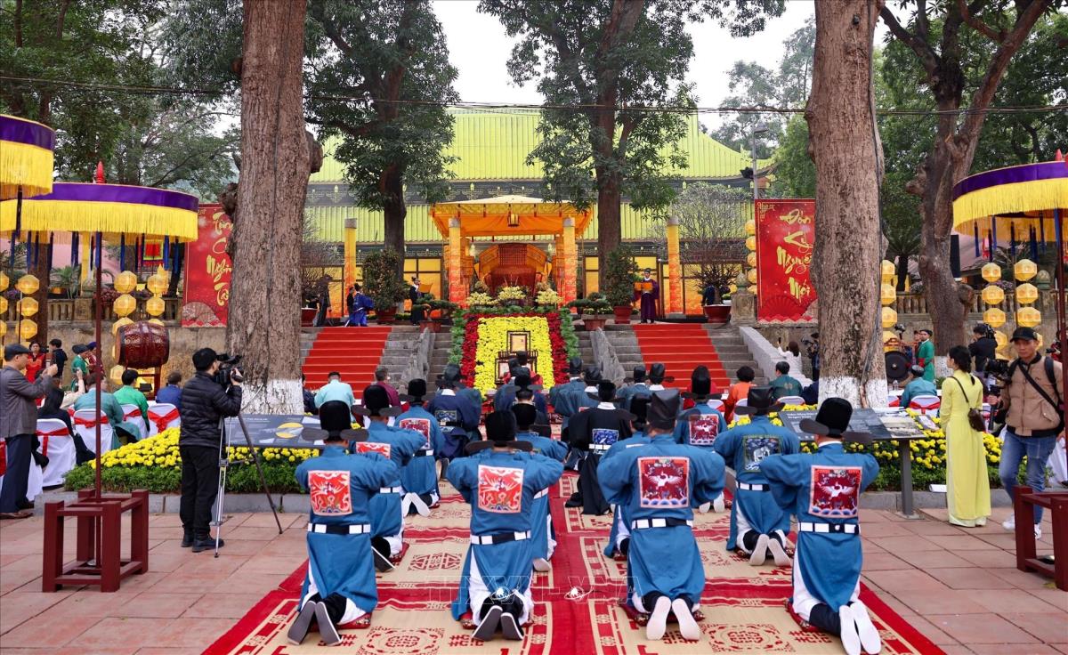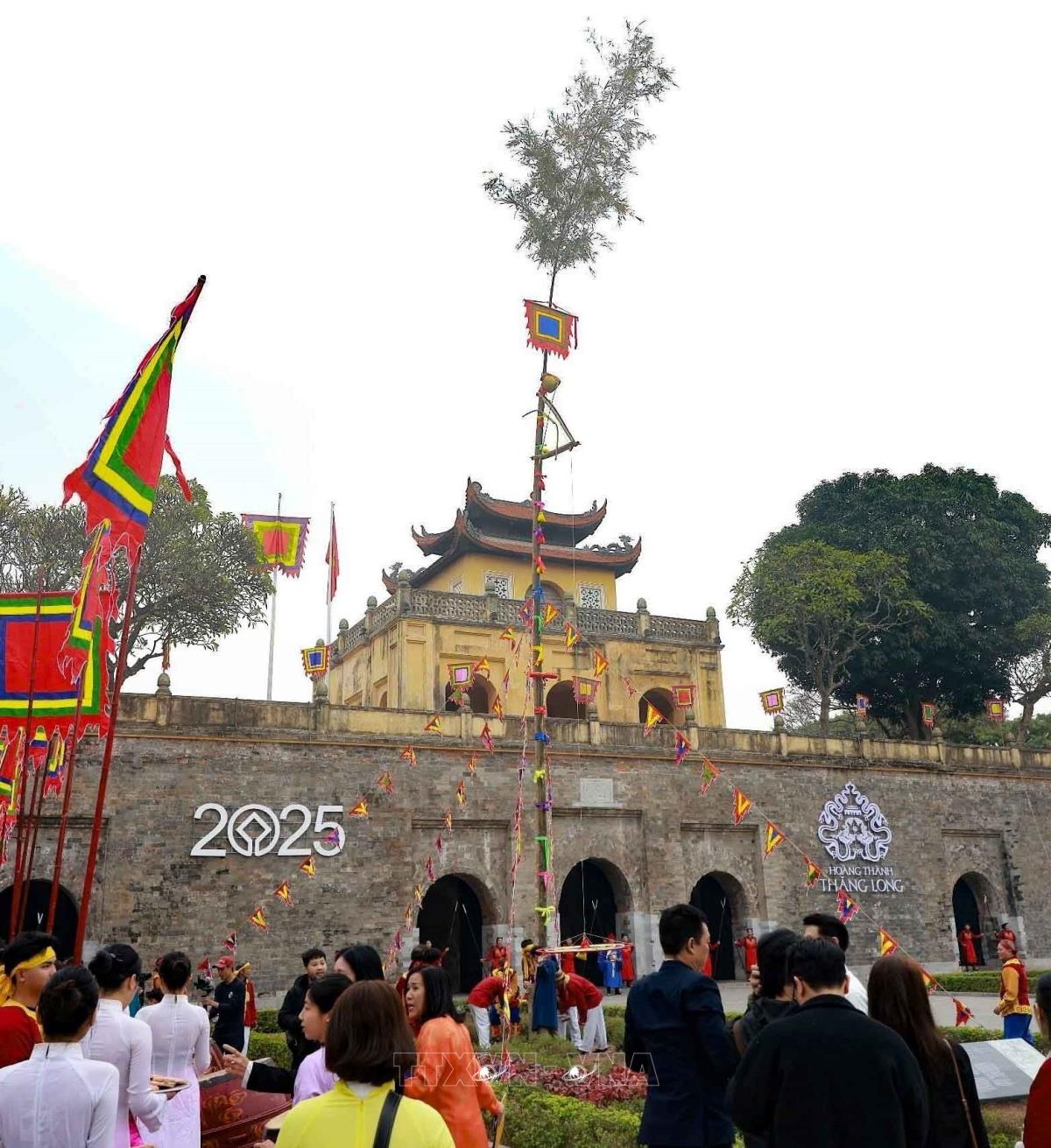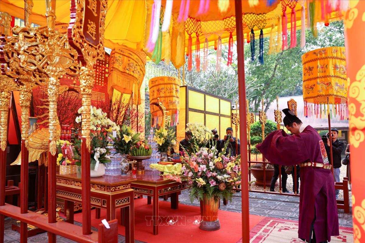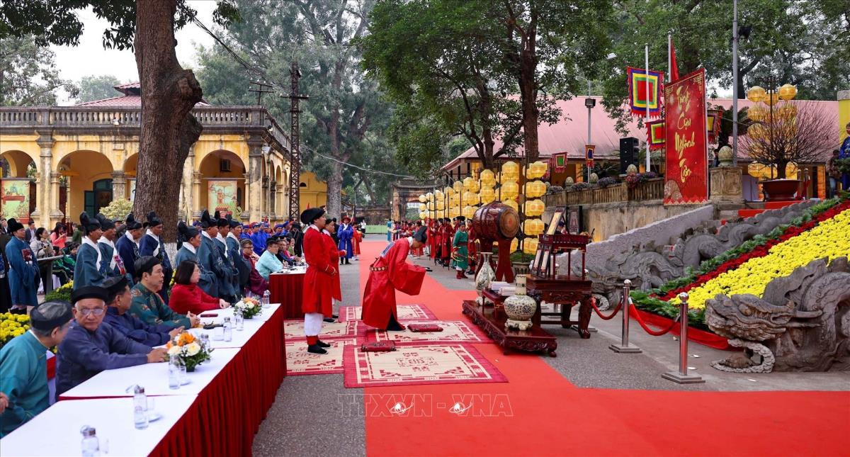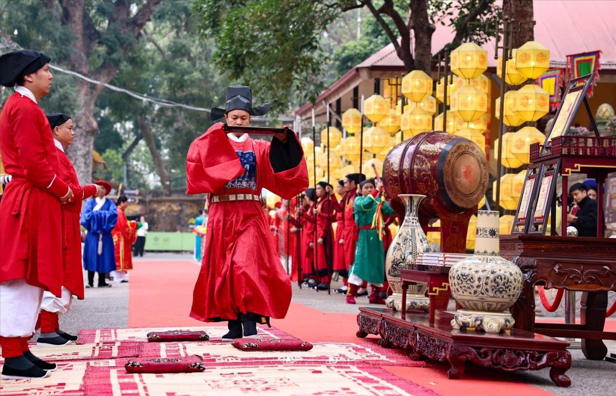 Chương trình thể nghiệm những lễ nghi trong dịp tết Nguyên đán đã từng diễn ra trong cung đình Thăng Long xưa, thể hiện mong muốn hưng thịnh cho quốc gia, sự bình an no ấm cho nhân dân (22/1/2025). Ảnh: Thanh Tùng - TTXVN