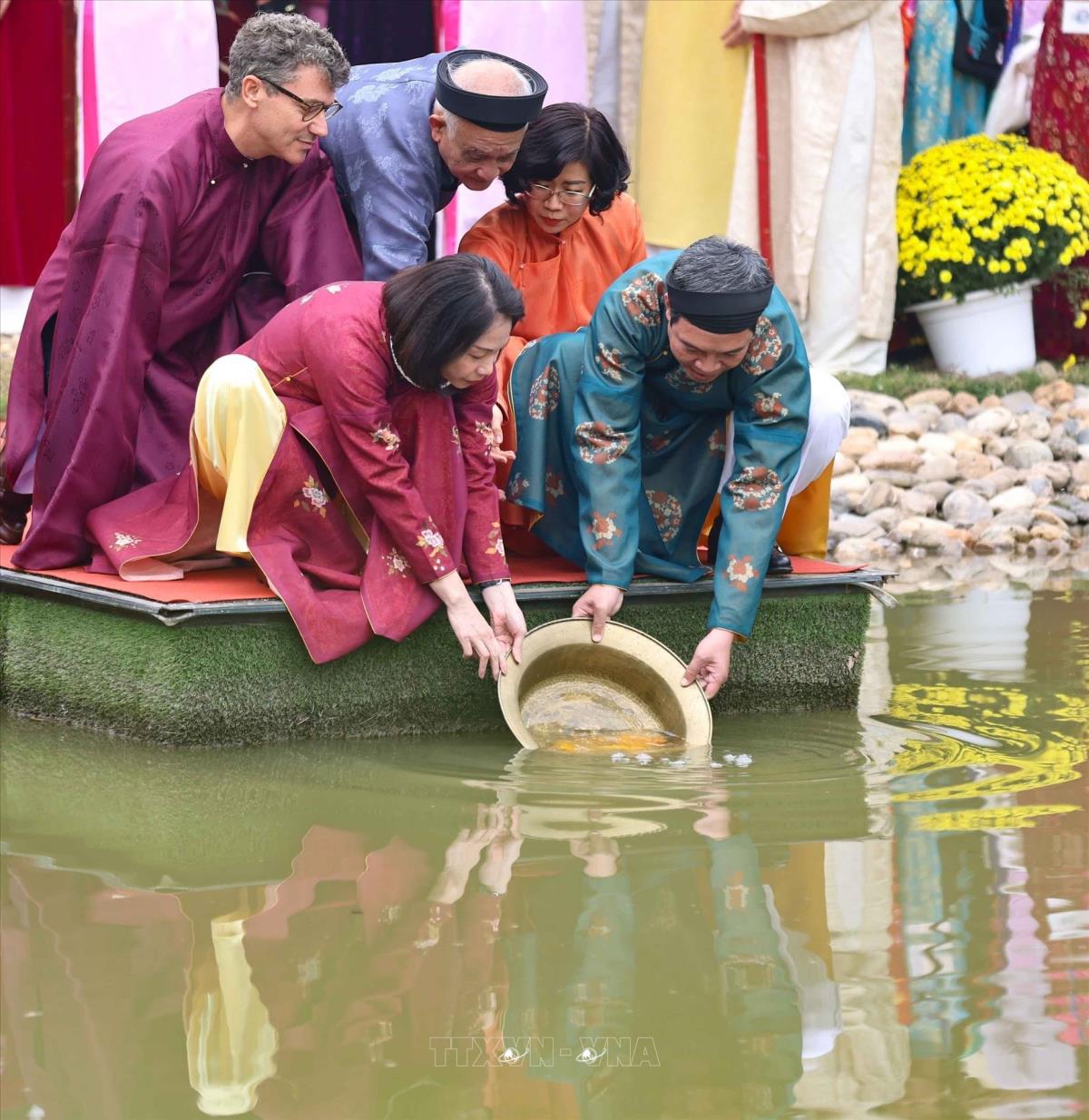 Phó Chủ tịch UBND thành phố Hà Nội Vũ Thu Hà cùng các đại biểu thực hiện nghi thức thả cá chép trong Tết ông Công, ông Táo (22/1/2025). Ảnh: Thanh Tùng - TTXVN