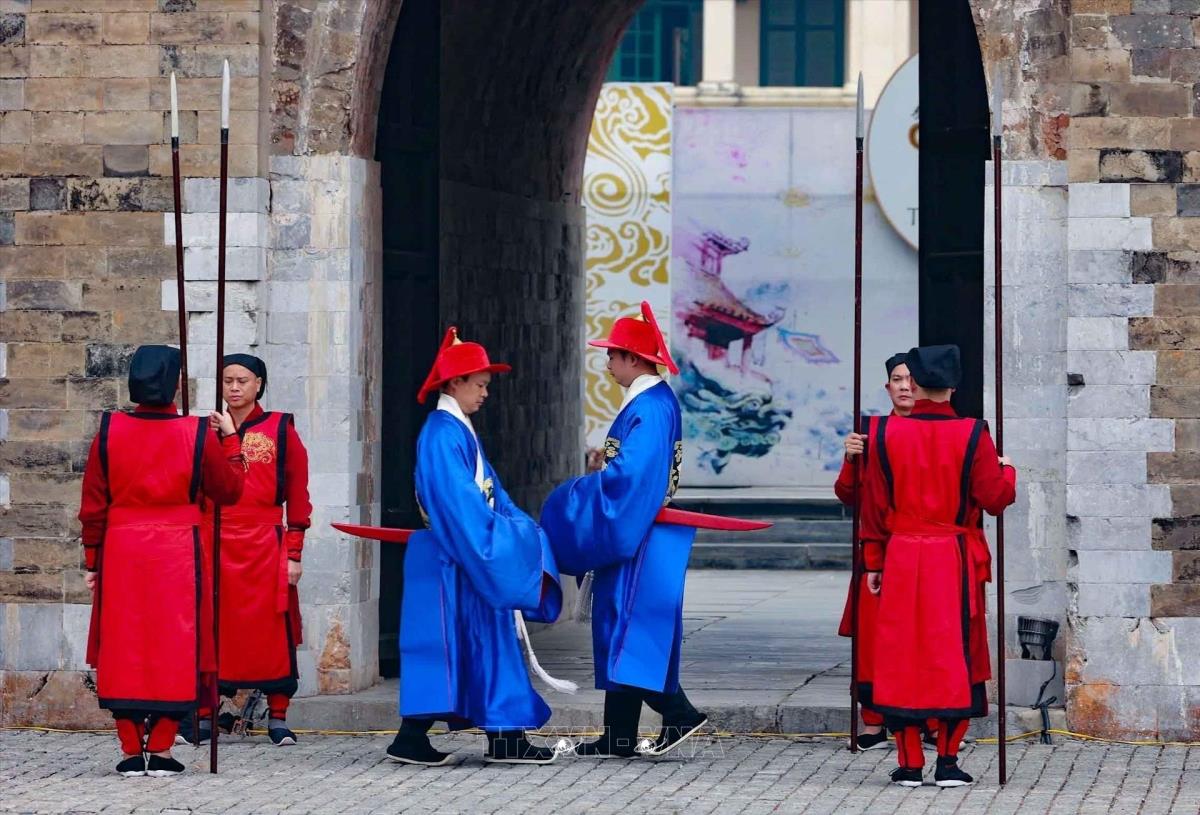 Tái hiện Lễ đổi gác trước sân Đoan Môn (22/1/2025). Ảnh: Thanh Tùng - TTXVN