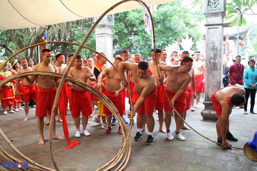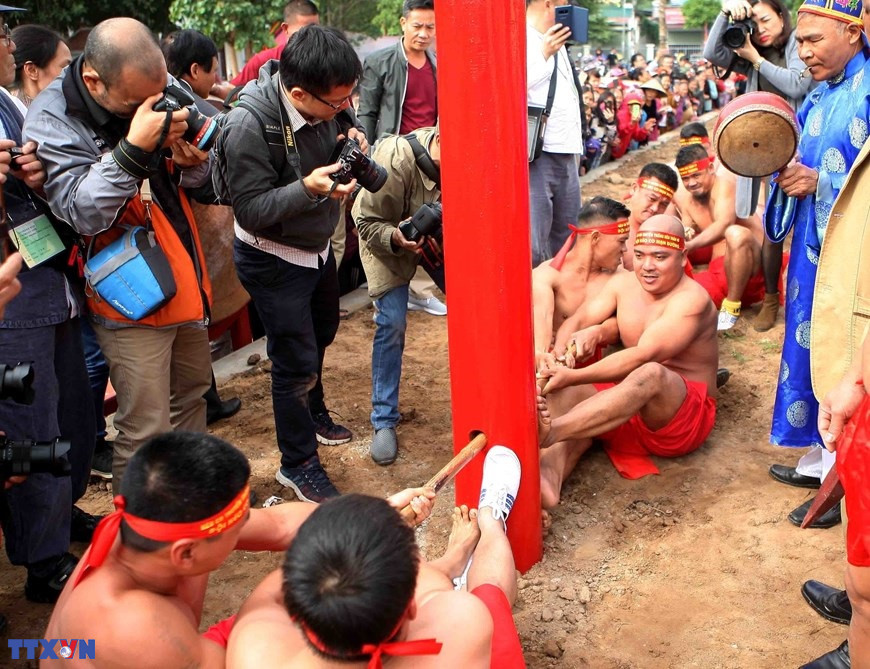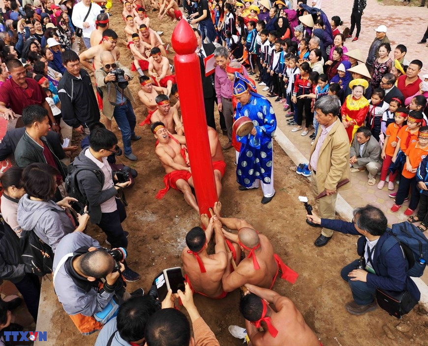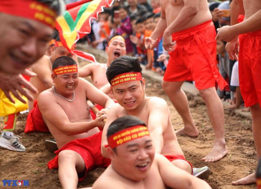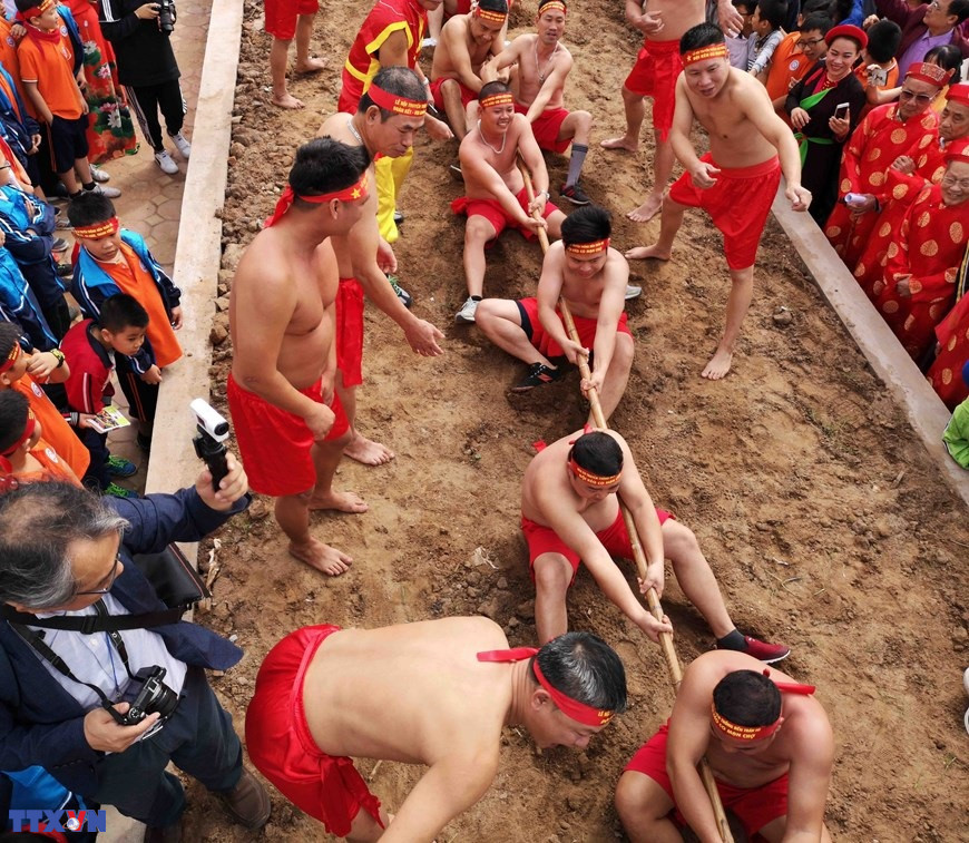 Nghi thức “kéo co ngồi” trong lễ hội là một nghi thức văn hóa dân gian rất có giá trị, một nét sinh hoạt văn hóa độc đáo của người dân nơi đây. (Ảnh: Thanh Tùng/TTXVN)