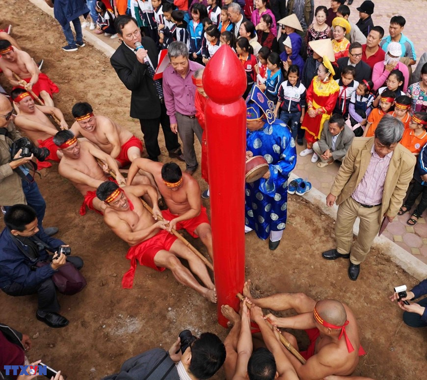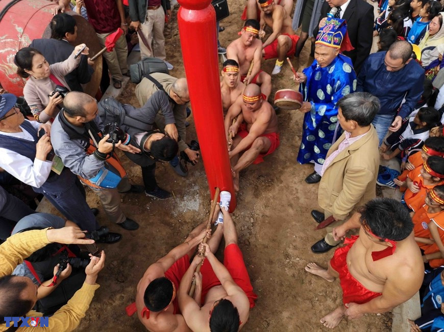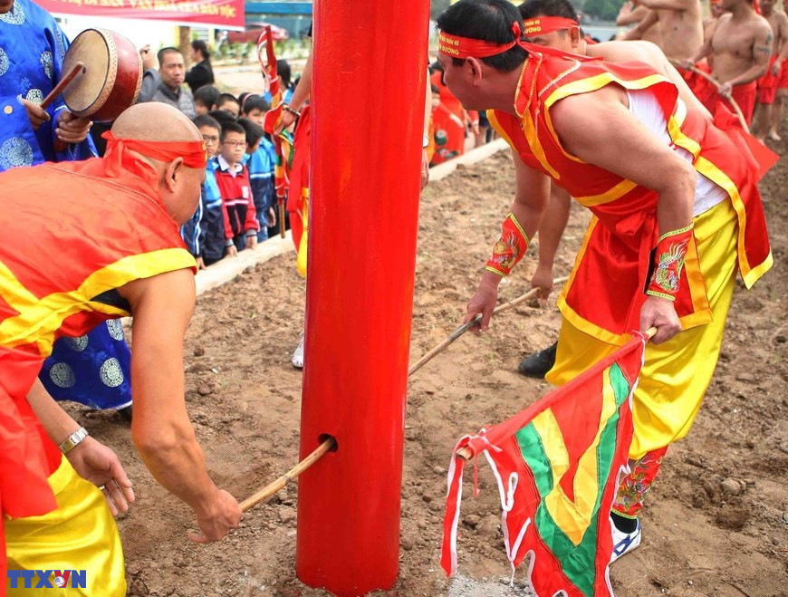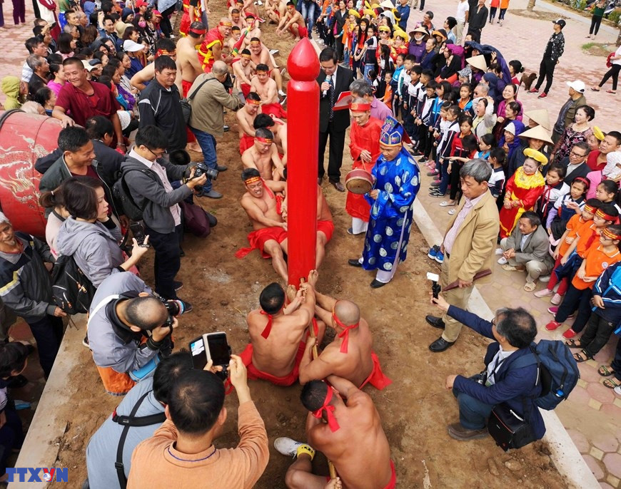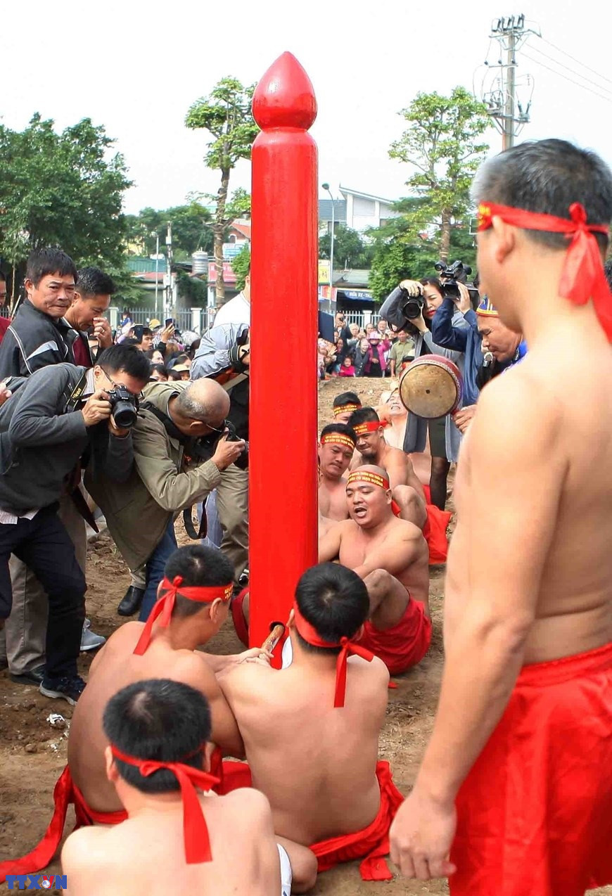 Nghi thức “kéo co ngồi” trong lễ hội là một nghi thức văn hóa dân gian rất có giá trị, một nét sinh hoạt văn hóa độc đáo của người dân nơi đây. (Ảnh: Thanh Tùng/TTXVN)