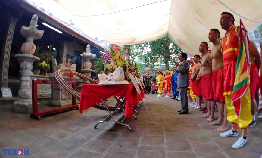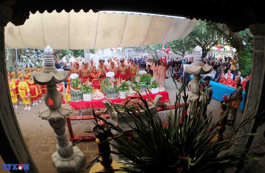 Lễ hội tổ chức thường niên vào ngày mùng 3 tháng 3 (Âm lịch) hàng năm thể hiện sự tôn kính của con người với thần linh, phản ảnh những ước mơ, khát vọng của con người mong muốn có cuộc sống an bình. (Ảnh: Thanh Tùng/TTXVN)