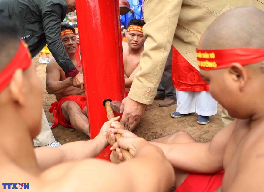 Cuộn dây kéo được các đội trưởng nâng lên 3 lần khi hành lễ. (Ảnh: Thanh Tùng/TTXVN)