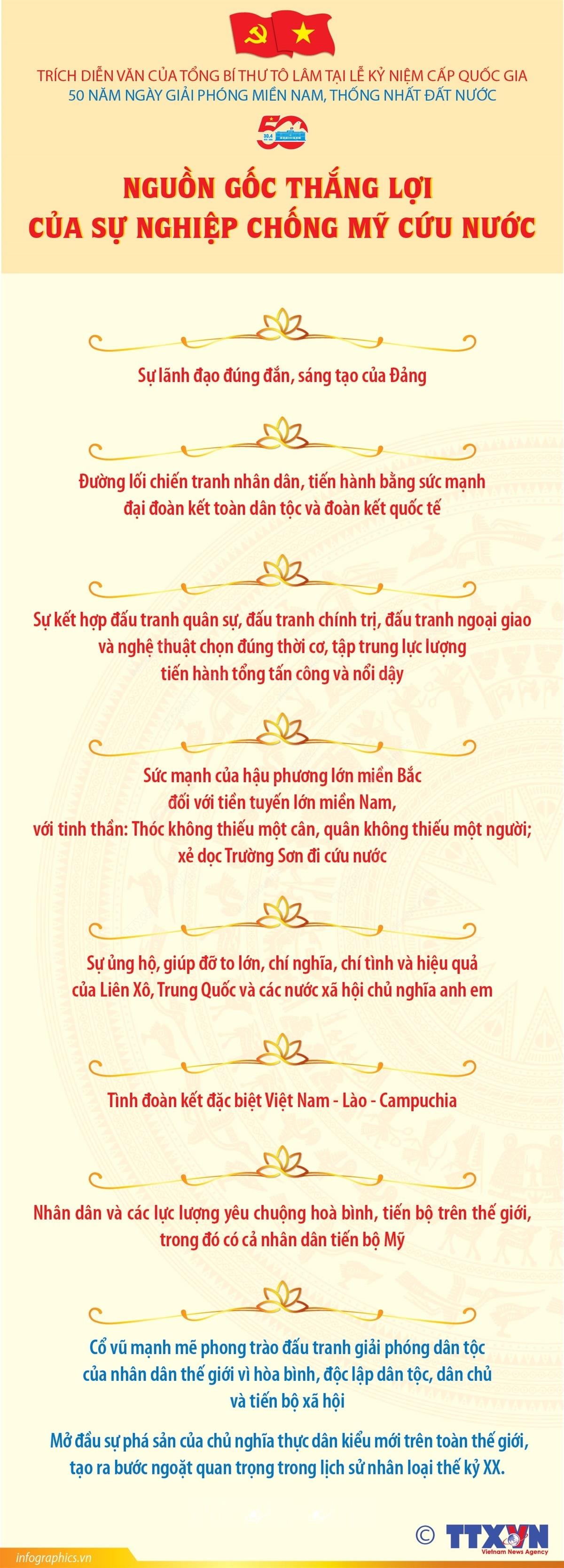 Hà Nội (TTXVN 30/4/2025) Trong bài diễn văn tại Lễ kỷ niệm cấp quốc gia 50 năm Ngày Giải phóng miền Nam, thống nhất đất nước ngay 30/4/2025, Tổng Bí thư Tô Lâm khẳng định: Thắng lợi của sự nghiệp kháng chiến chống Mỹ cứu nước bắt nguồn từ sự lãnh đạo đúng đắn, sáng tạo của Đảng; từ đường lối chiến tranh nhân dân, tiến hành bằng sức mạnh đại đoàn kết toàn dân tộc và đoàn kết quốc tế; từ sự kết hợp đấu tranh quân sự, đấu tranh chính trị, đấu tranh ngoại giao và nghệ thuật chọn đúng thời cơ, tập trung lực lượng tiến hành tổng tấn công và nổi dậy; từ sức mạnh của hậu phương lớn miền Bắc đối với tiền tuyến lớn miền Nam, với tinh thần: Thóc không thiếu một cân, quân không thiếu một người; xẻ dọc Trường Sơn đi cứu nước; từ sự ủng hộ, giúp đỡ to lớn, chí nghĩa, chí tình và hiệu quả của Liên Xô, Trung Quốc và các nước xã hội chủ nghĩa anh em; của tình đoàn kết đặc biệt Việt Nam - Lào - Campuchia; của nhân dân và các lực lượng yêu chuộng hòa bình, tiến bộ trên thế giới, trong đó có cả nhân dân tiến bộ Mỹ. Đặc biệt, Đại thắng mùa Xuân năm 1975 đã cổ vũ mạnh mẽ phong trào đấu tranh giải phóng dân tộc của nhân dân thế giới vì hòa bình, độc lập dân tộc, dân chủ và tiến bộ xã hội; mở đầu sự phá sản của chủ nghĩa thực dân kiểu mới trên toàn thế giới, tạo ra bước ngoặt quan trọng trong lịch sử nhân loại thế kỷ XX.