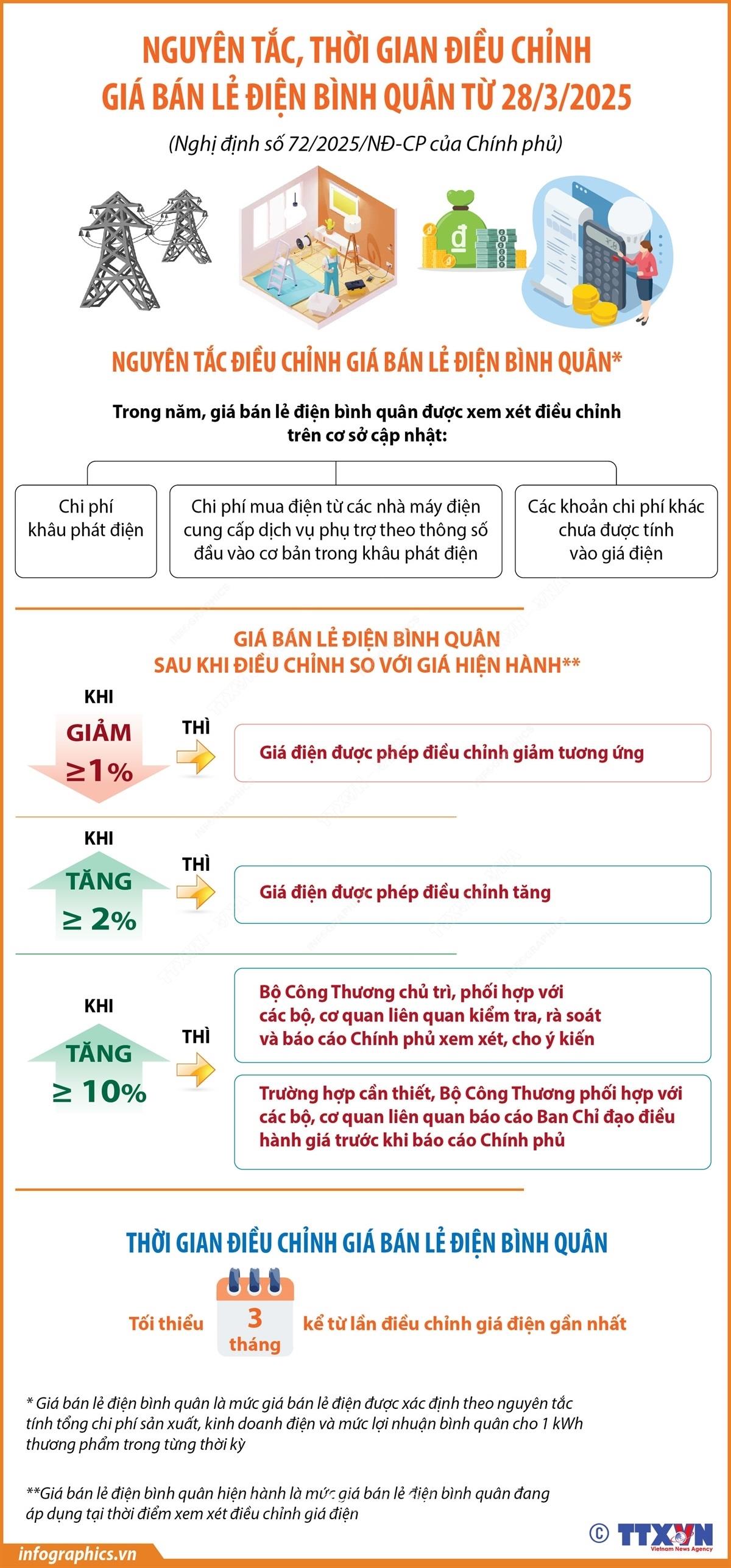 Hà Nội (TTXVN 3/4/2025) Theo Nghị định số 72/2025/NĐ-CP, có hiệu lực từ ngày 28/3/2025, giá bán lẻ điện bình quân được xem xét điều chỉnh trên cơ sở cập nhật chi phí khâu phát điện, chi phí mua điện từ các nhà máy điện cung cấp dịch vụ phụ trợ theo thông số đầu vào cơ bản trong khâu phát điện và các khoản chi phí khác chưa được tính vào giá điện.