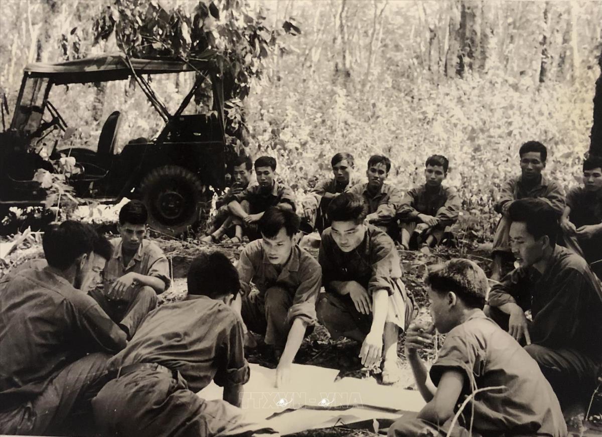 Ban chỉ huy Trung đoàn 66 trải bản đồ do nhà báo Đinh Quang Thành tặng ra giữa rừng cao su, nghiên cứu kỹ càng từng tuyến đường vào Sài Gòn. Ảnh: TTXVN phát