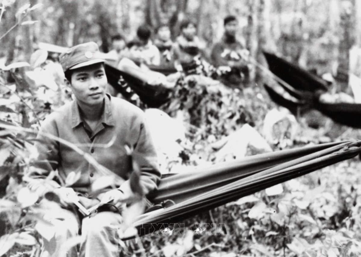 Nhà báo Nguyễn Dĩnh, phóng viên Thông tấn quân sự trên đường Trường Sơn trong chuyến đi công tác vào B2 (miền Đông Nam Bộ, tháng 12/1973). Ảnh: TTXVN phát