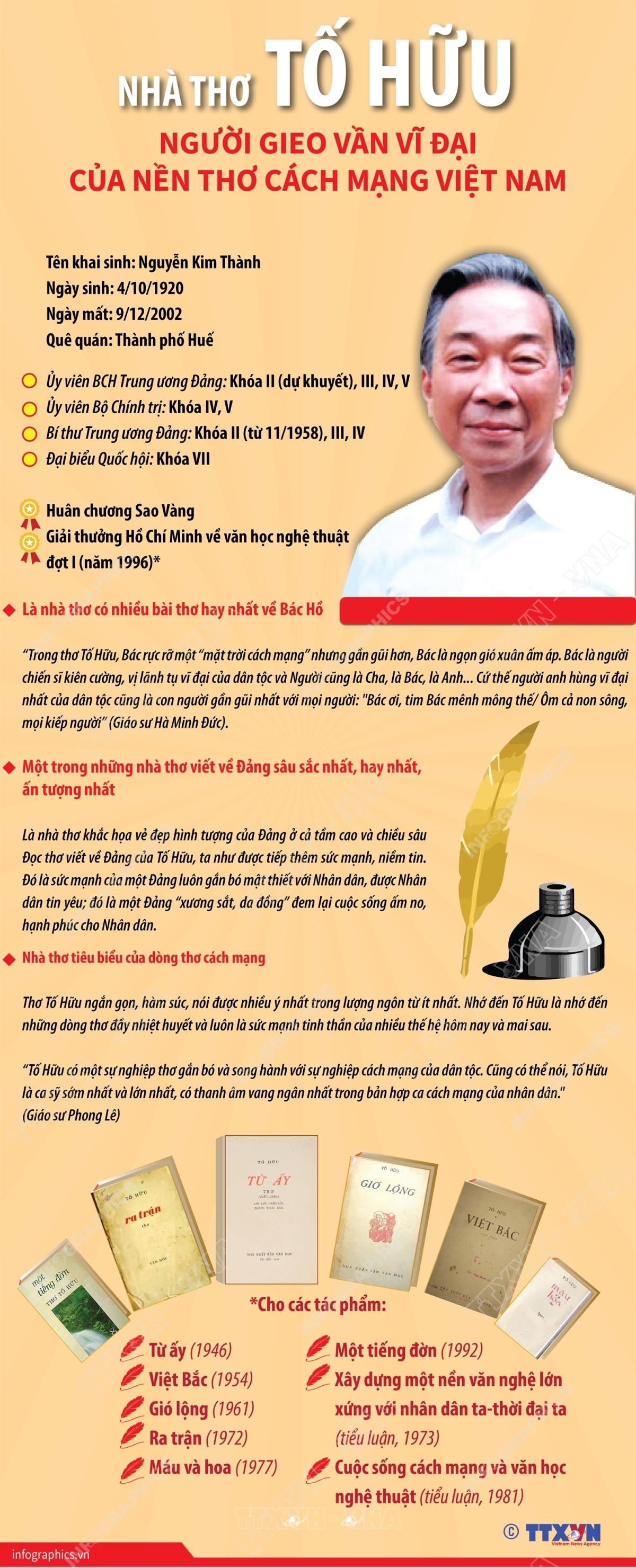 Khi nhớ về Tố Hữu, nhiều người thuộc các thế hệ ở thập niên 30 của thế kỷ trước cho đến sau này luôn yêu mến gọi ông là nhà văn hóa lớn, nhà thơ lớn, ngọn cờ đầu, cánh chim đầu đàn của văn nghệ cách mạng Việt Nam; hay thân thương và ngắn gọn hơn - là Tố Hữu, nhà thơ của đất nước, của nhân dân, của cách mạng. Ông sinh ngày 4/10/1920, cách đây 105 năm.