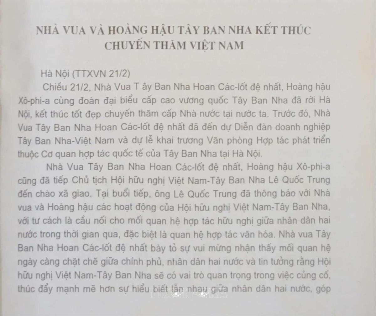 Nhà Vua và Hoàng hậu Tây Ban Nha kết thúc chuyến thăm Việt Nam Tin Trong nước của Thông tấn xã Việt Nam, ngày 21/2/2006 Từ khóa:Việt Nam-Tây Ban NhaNhà vua Tây Ban Nha Juan Carlos