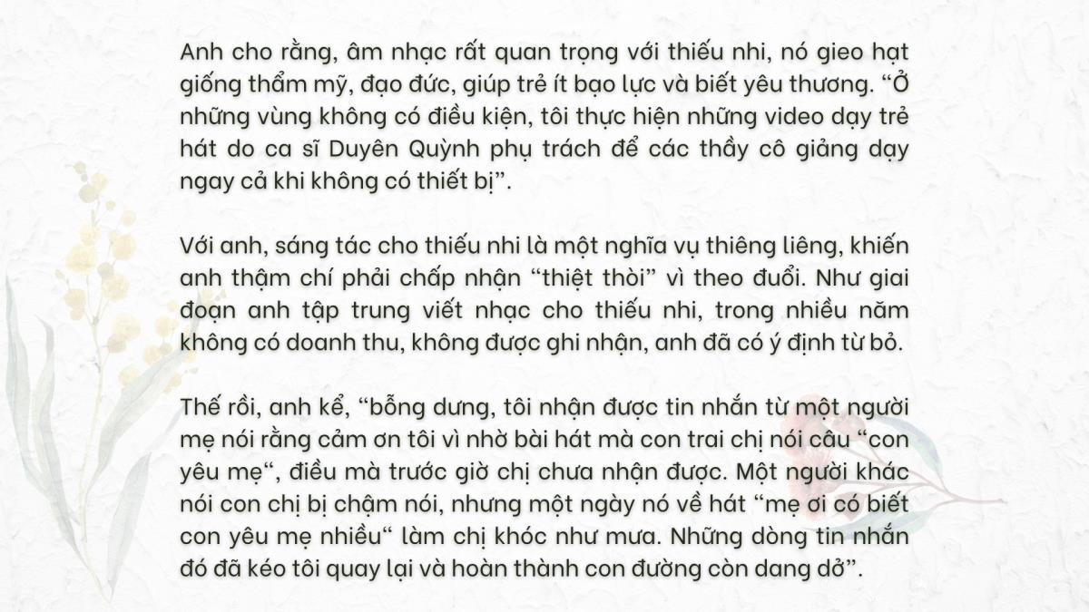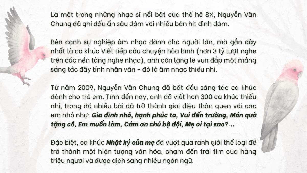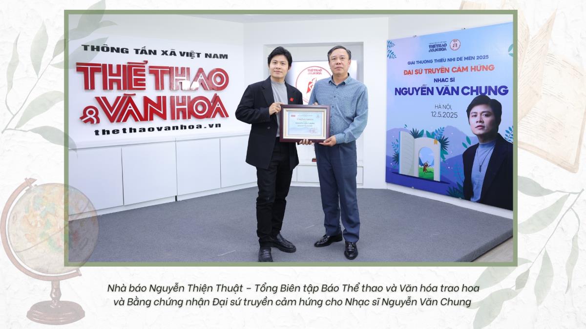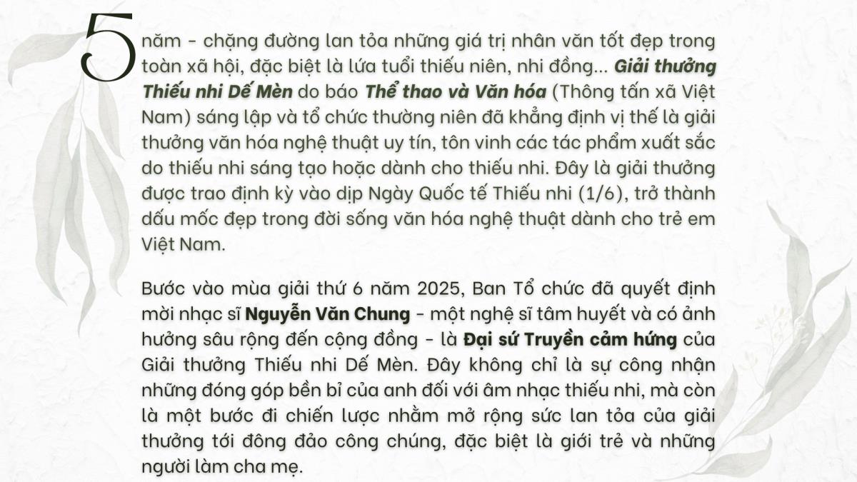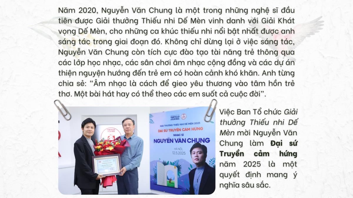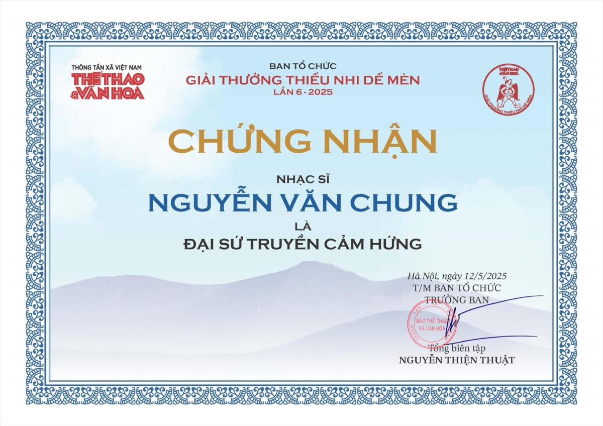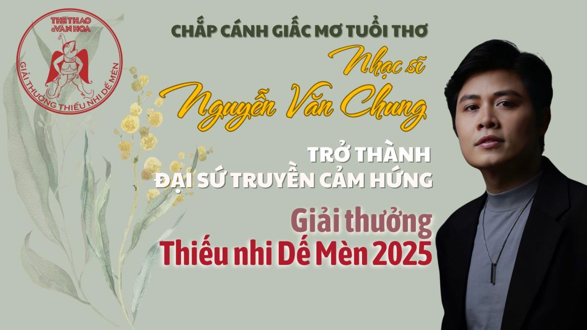 Nhạc sĩ Nguyễn Văn Chung - Trở thành đại sứ truyền cảm hứng ''Giải thưởng Thiếu nhi Dế mèn 2025'' Hà Nội (TTXVN 13/5/2025) Giải thưởng Thiếu nhi Dế Mèn lần 6 - 2025Bài: Báo Thể thao và Văn hóaTrình bày: Phạm HuyẢnh: TTXVN, NVCC Từ khóa:Nhạc sĩ Nguyễn Văn ChungGiải thưởng thiếu nhi Dế mènĐại sứ truyền cảm hứng