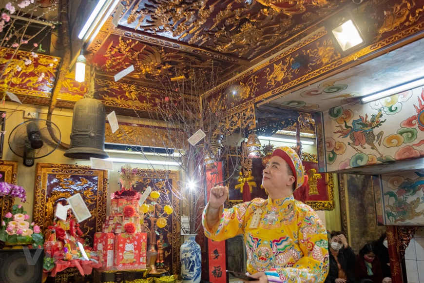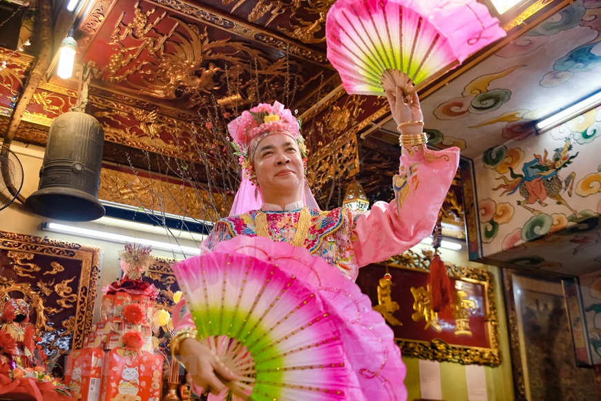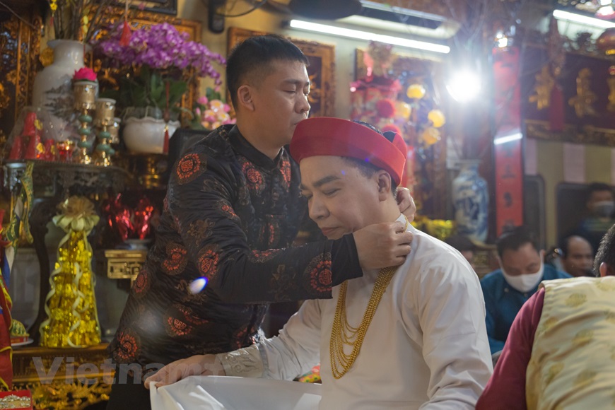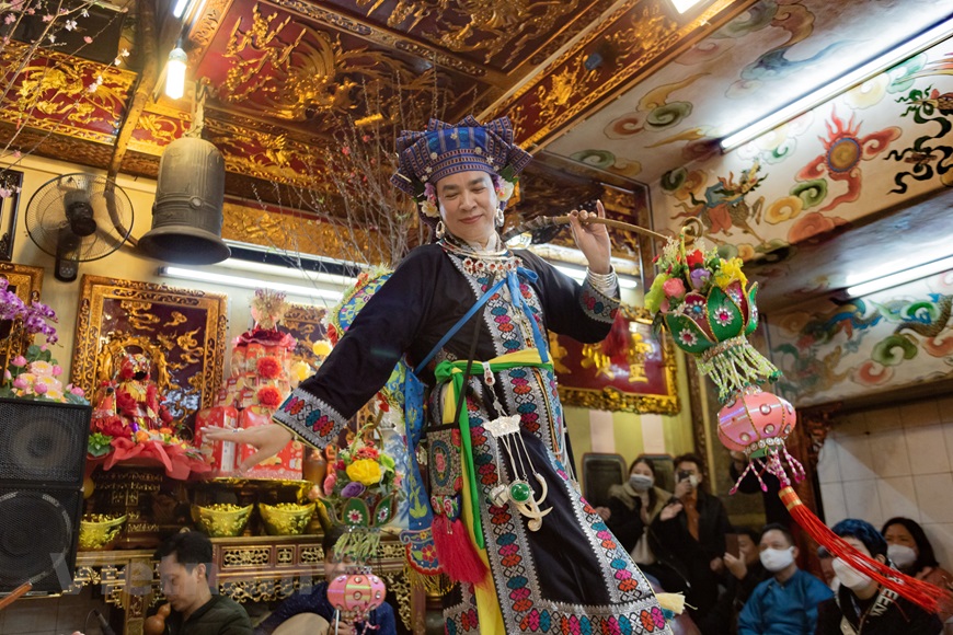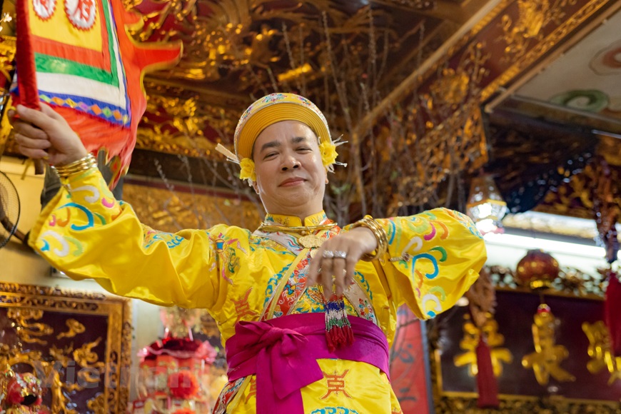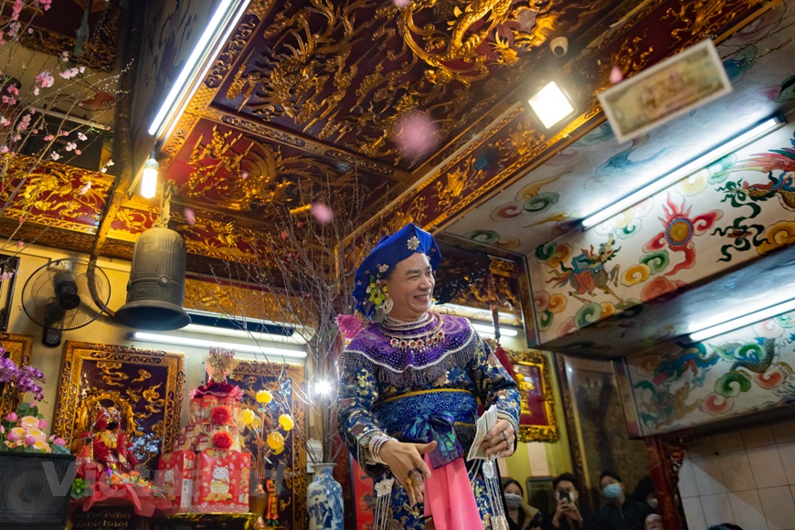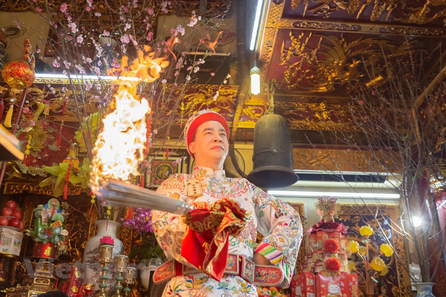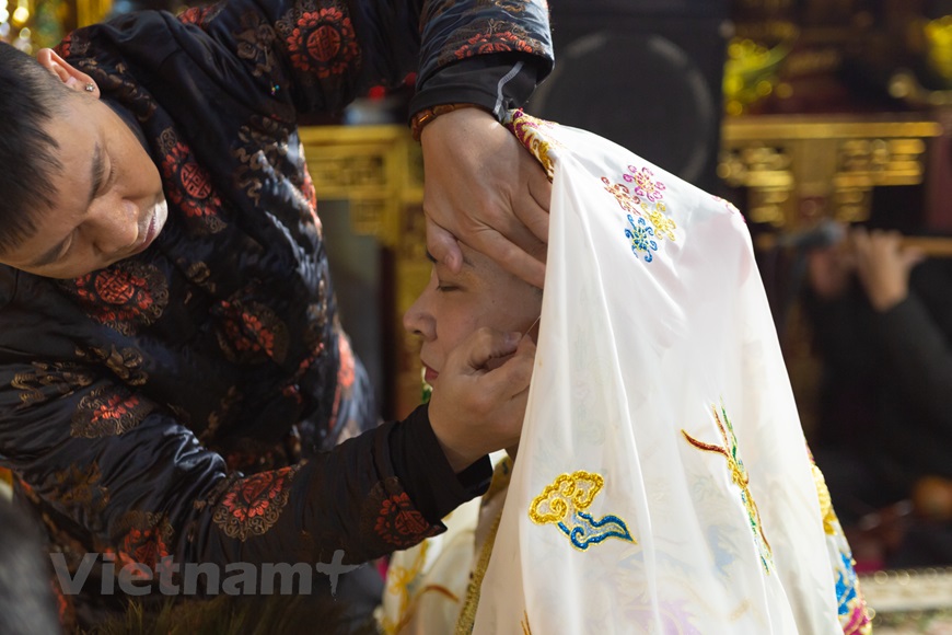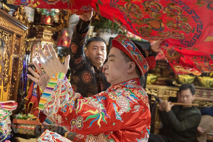 Nhân Tết Thượng Nguyên (Rằm tháng Giêng), nghệ nhân ưu tú Nguyễn Tất Kim Hùng, thủ nhang đền Nguyên Khiết Linh Từ (102 Hàng Bạc, Hà Nội) đã tiến hành Nghi lễ Hầu đồng. Đây là một nghi lễ trong Tín ngưỡng thờ Mẫu Tam phủ của người Việt đã được UNESCO vinh danh là Di sản Văn hóa Phi vật thể đại diện của Nhân loại. (Ảnh: Minh Thu/Vietnam+)