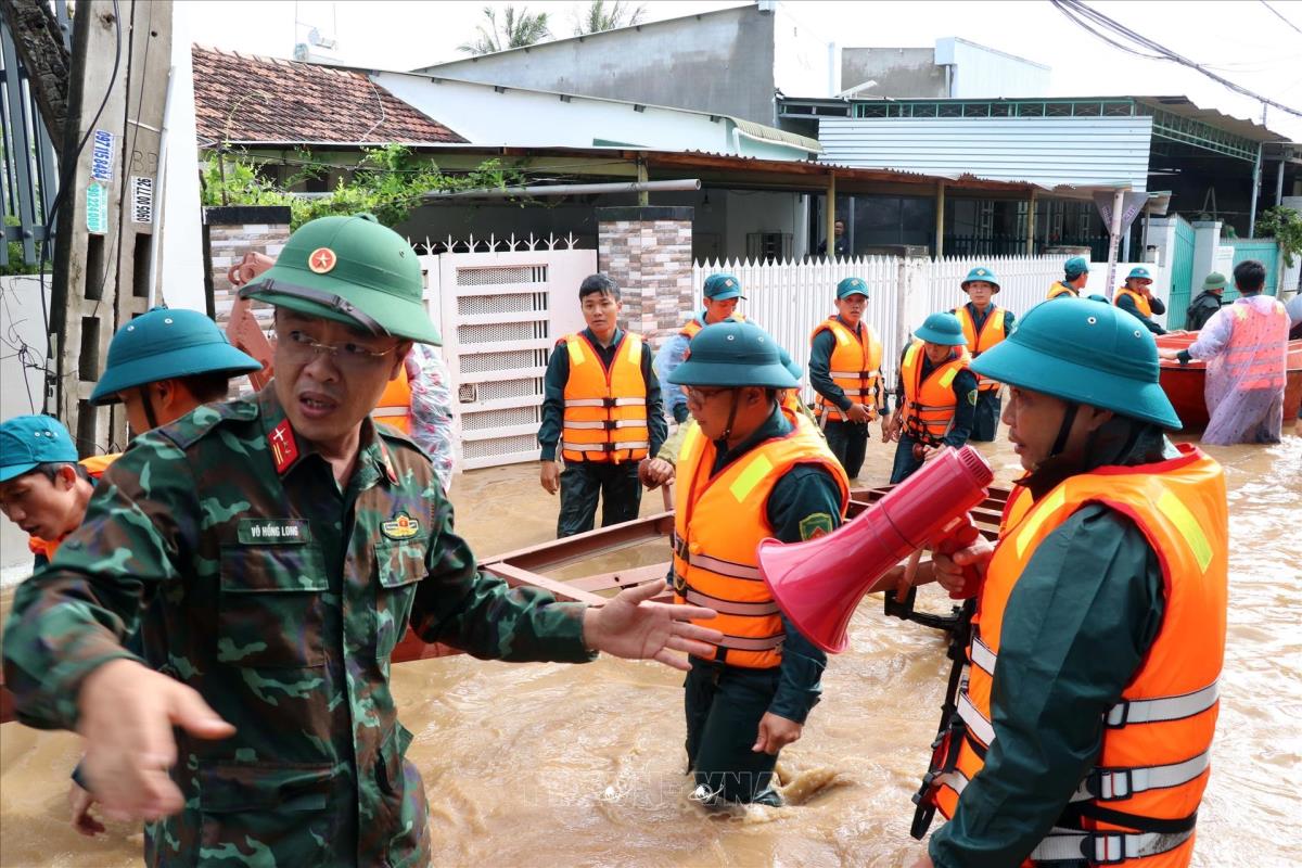 Lực lượng cứu hộ vào thôn Phước Khánh (xã Ninh Phước) để đưa người dân bị mưa lũ cô lập ra ngoài. Ảnh: Công Thử - TTXVN