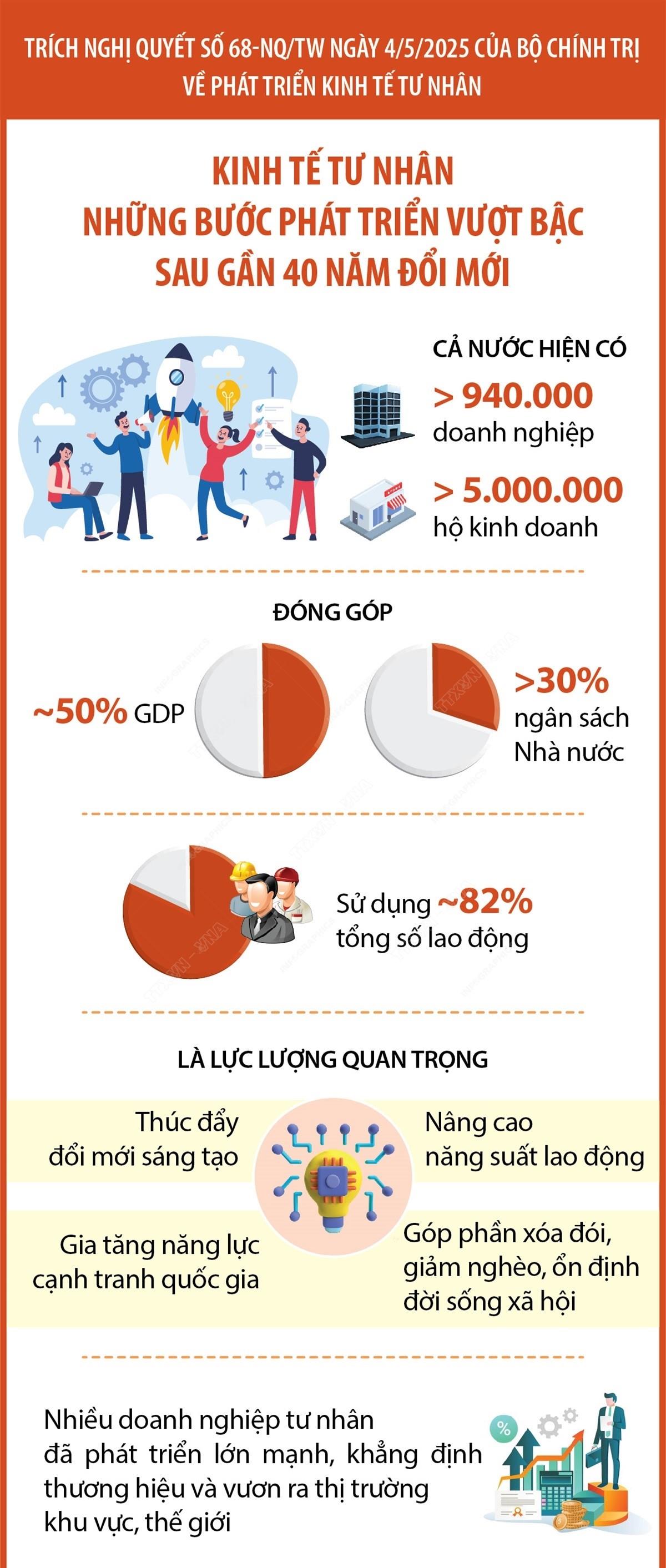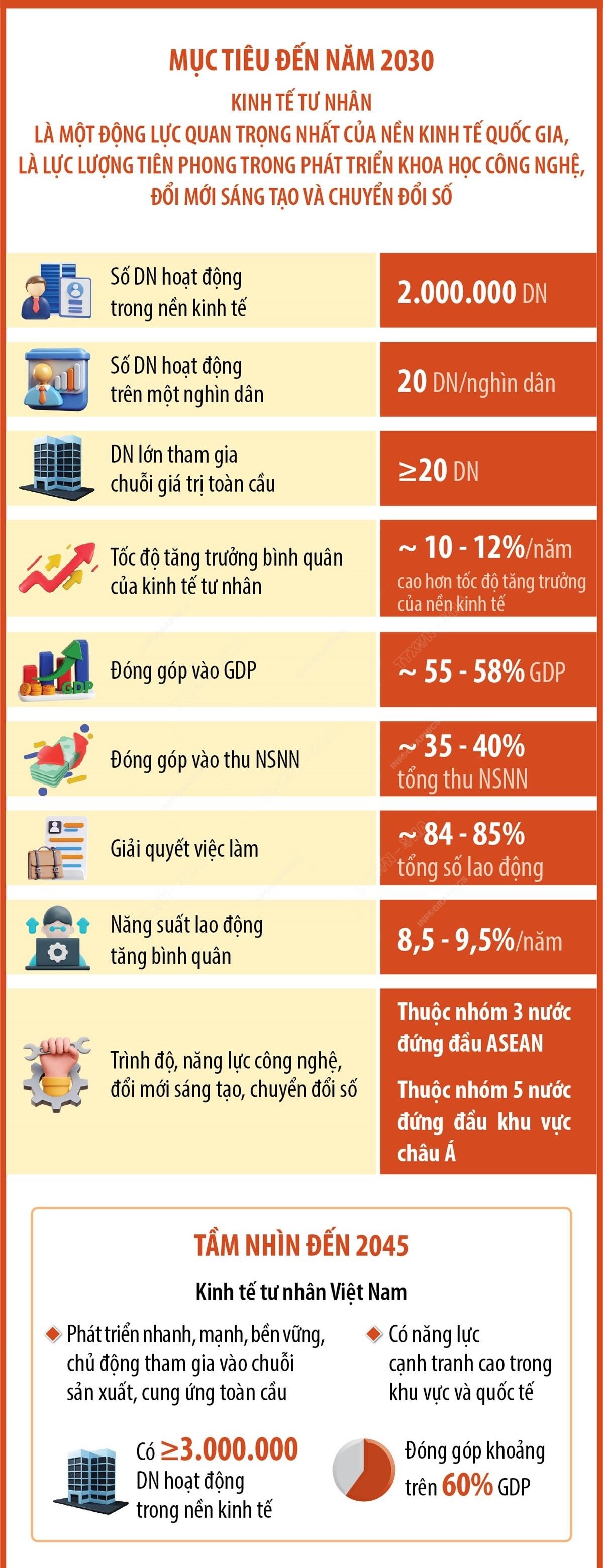 Khu vực kinh tế tư nhân hiện có khoảng hơn 940.000 doanh nghiệp và hơn 5 triệu hộ kinh doanh đang hoạt động, đóng góp khoảng 50% GDP, hơn 30% tổng thu ngân sách nhà nước và sử dụng khoảng 82% tổng số lao động vào tăng trưởng kinh tế, tạo việc làm, là lực lượng quan trọng thúc đẩy đổi mới sáng tạo, nâng cao năng suất lạo động, gia tăng năng lực cạnh tranh quốc gia, góp phần xóa đói, giảm nghèo, ổn định đời sống xã hội.