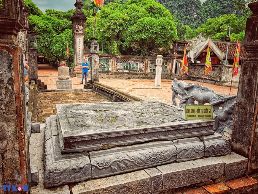 Nằm ở trung tâm thành Đông của kinh đô Hoa Lư xưa (nay thuộc xã Trường Yên, Hoa Lư, tỉnh Ninh Bình), đền thờ Vua Đinh Tiên Hoàng là di tích có tầm quan trọng đặc biệt của quần thể di sản cố đô Hoa Lư. Giữa bình phong và Ngọ môn quan có một long sàng bằng đá được chạm hình rồng sinh động. (Ảnh: Xuân Mai/Vietnam+)