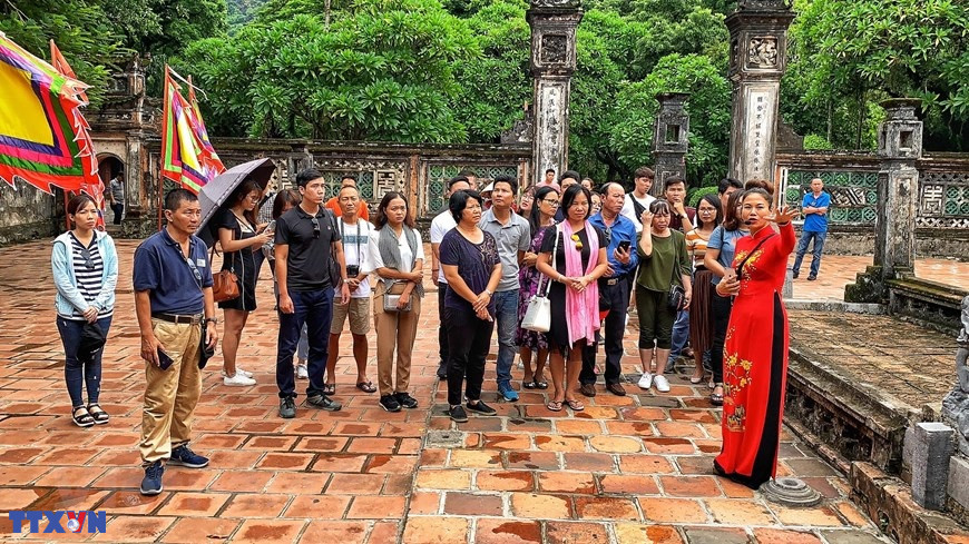 Hướng dẫn viên du lịch thuyết minh về di tích lịch sử đền vua Đinh Tiên Hoàng. (Ảnh: Xuân Mai/Vietnam+)