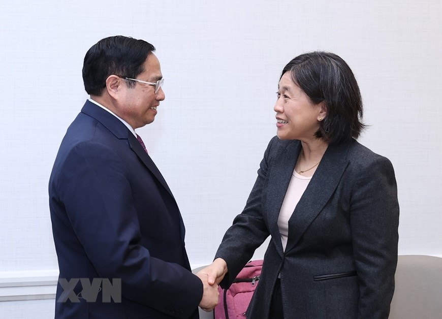 Thủ tướng Phạm Minh Chính tiếp Trưởng Đại diện Thương mại Hoa Kỳ Katherine Tai. (Ảnh: Dương Giang/TTXVN)
