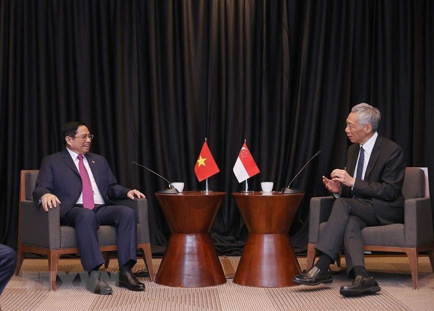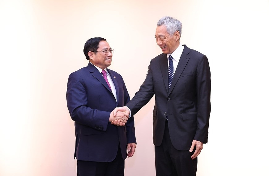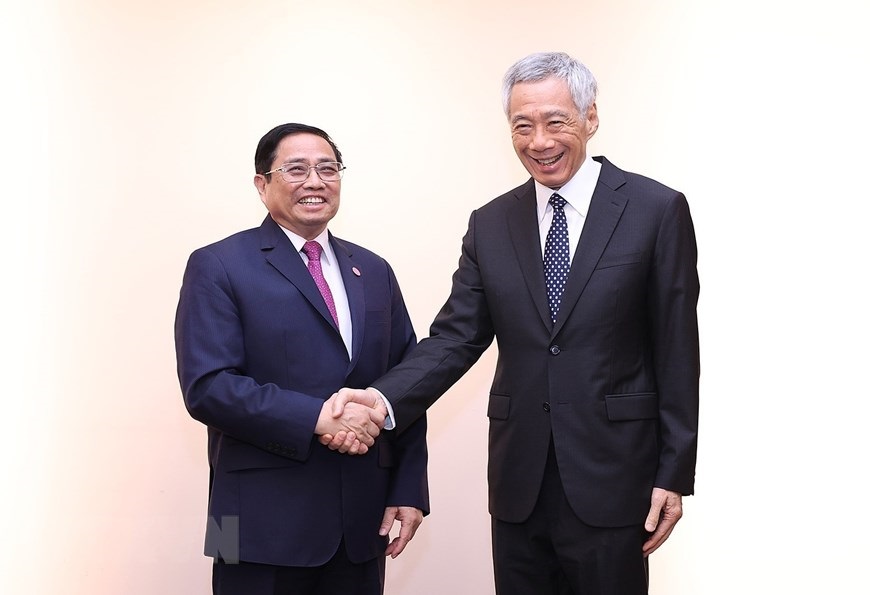 Thủ tướng Phạm Minh Chính gặp Thủ tướng Singapore Lý Hiển Long. (Ảnh: Dương Giang/TTXVN)