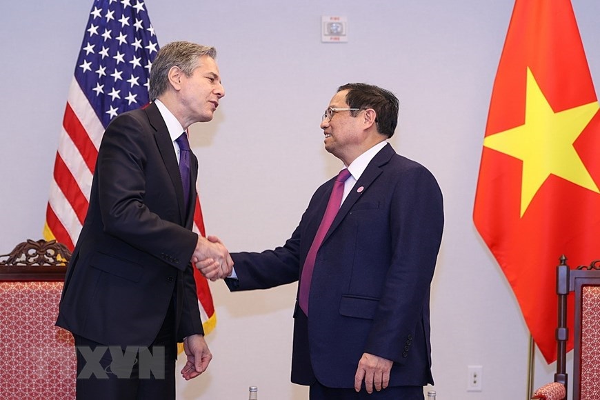 Thủ tướng Phạm Minh Chính và Ngoại trưởng Hoa Kỳ Antony Blinken. (Ảnh: Dương Giang/TTXVN)