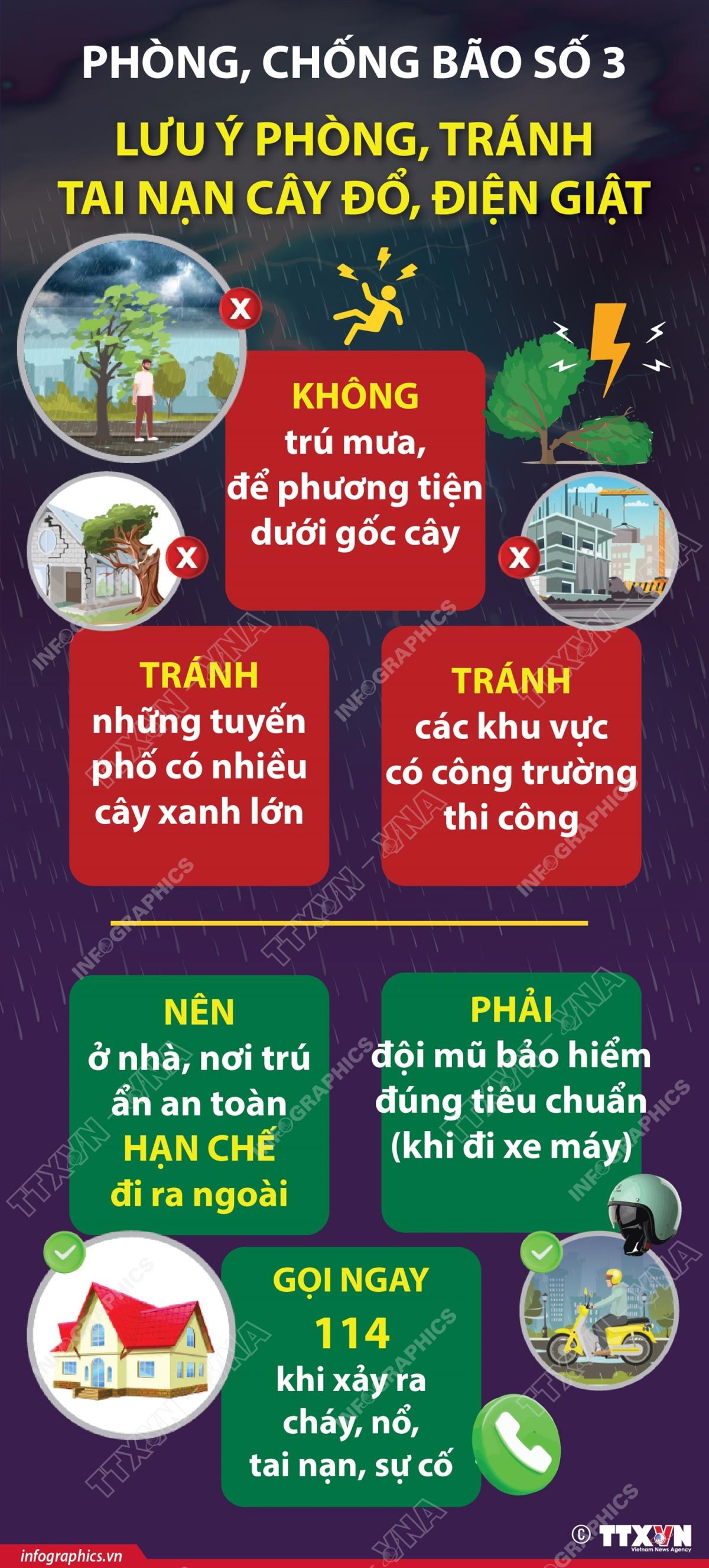 Hà Nội (TTXVN 22/7/2025) Trước diễn biến khó lường của bão số 3, nhằm giảm thiểu thiệt hại do bão gây ra, người dân nên ở trong nhà, hạn chế tối đa đi ra ngoài nếu không cần thiết. Nếu buộc phải di chuyển, tránh những tuyến phố có nhiều cây xanh lớn vì mưa bão, gió giật thường đi kèm hiện tượng sét, cây đổ.