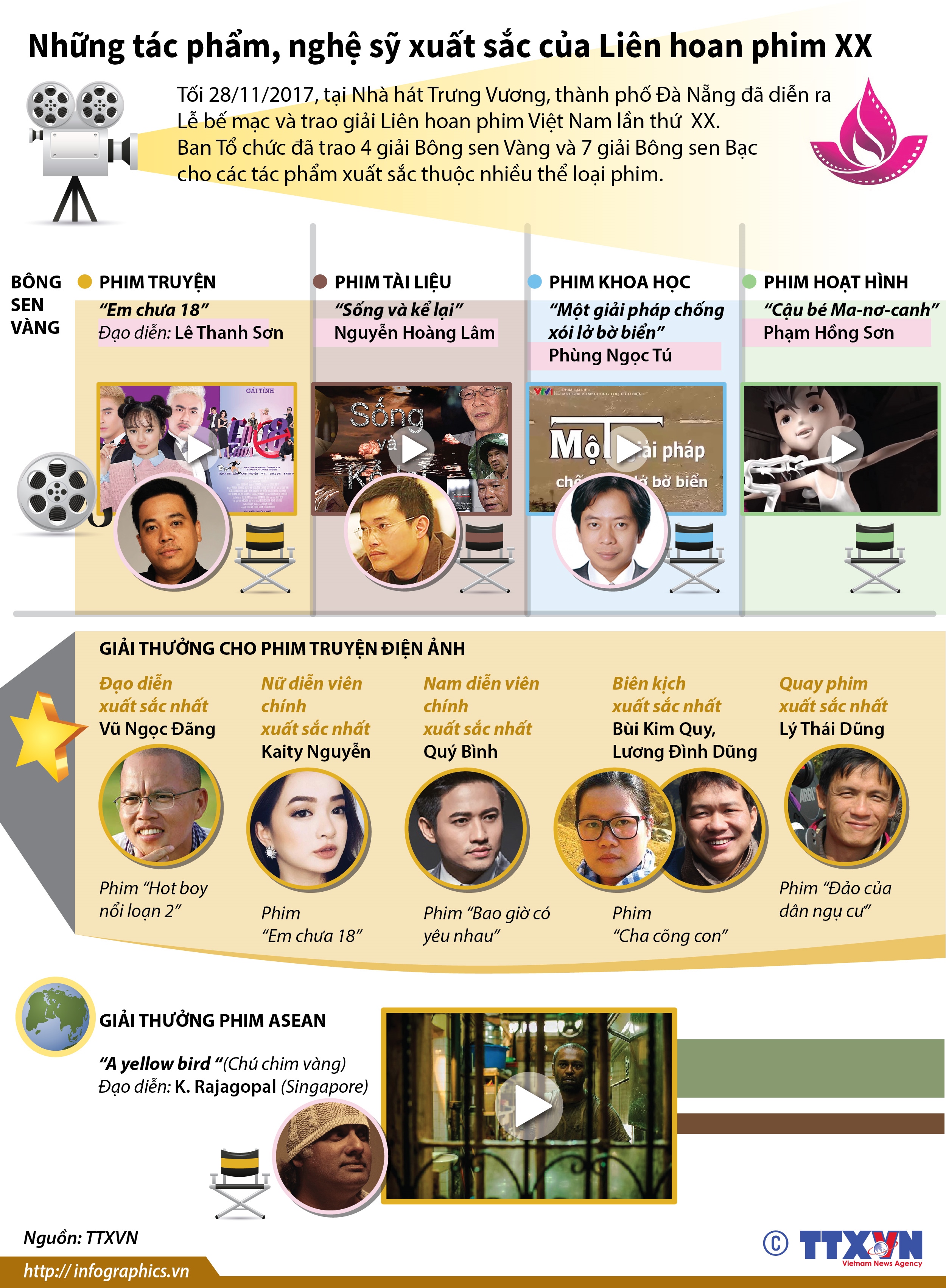 Hà Nội (TTXVN 29/11/2017) Tối 28/11/2017, tại Nhà hát Trưng Vương, thành phố Đà Nẵng đã diễn ra Lễ bế mạc và trao giải Liên hoan phim Việt Nam lần thứ XX. Ban Tổ chức đã trao 4 giải Bông sen Vàng và 7 giải Bông sen Bạc cho các tác phẩm xuất sắc thuộc nhiều thể loại phim.