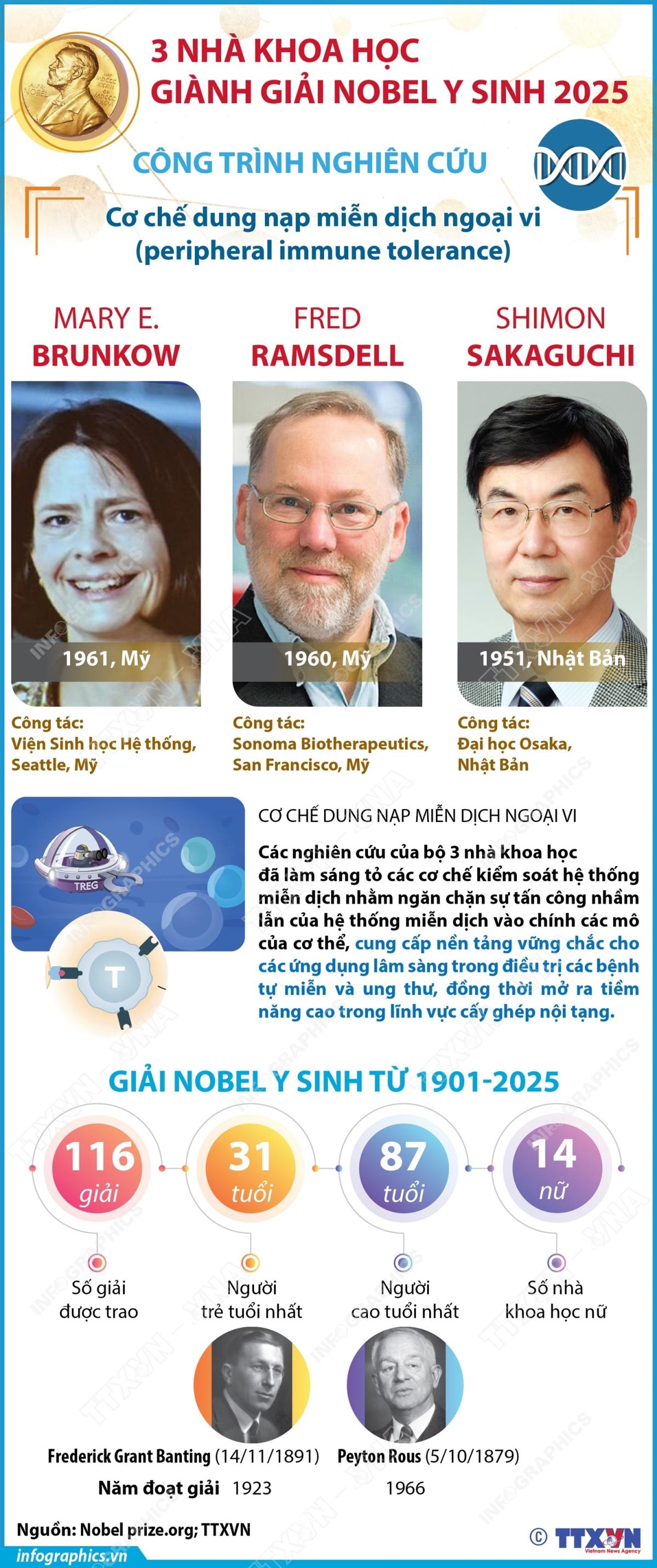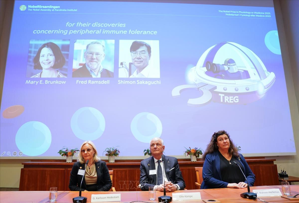 Hà Nội (TTXVN 6/10/2025) Hội đồng Nobel tại Viện Karolinska đã quyết định trao giải Nobel Y sinh năm nay cho 3 nhà khoa học Mary E. Brunkow (Mỹ), Fred Ramsdell (Mỹ) và Shimon Sakaguchi (Nhật Bản) nhằm tôn vinh những đóng góp mang tính đột phá của họ trong lĩnh vực sinh học miễn dịch mà cụ thể là cơ chế dung nạp miễn dịch ngoại vi (peripheral immune tolerance).