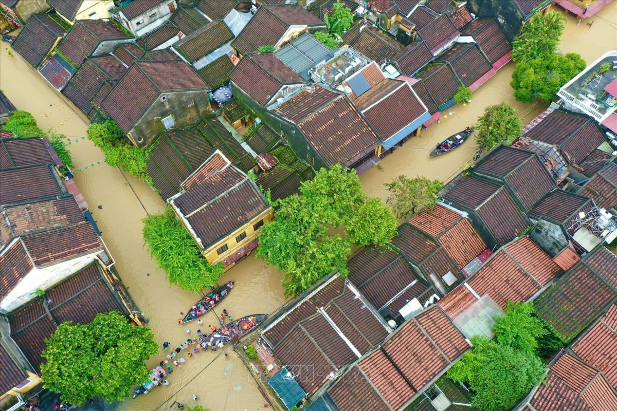 Nước lũ đổ về ngập sát các mái nhà phố cổ Hội An (tháng 10/2025). Ảnh: Trần Lê Lâm - TTXVN