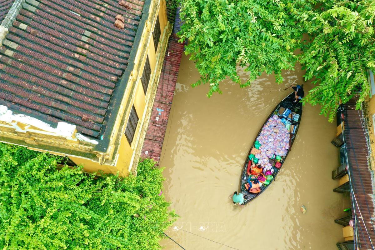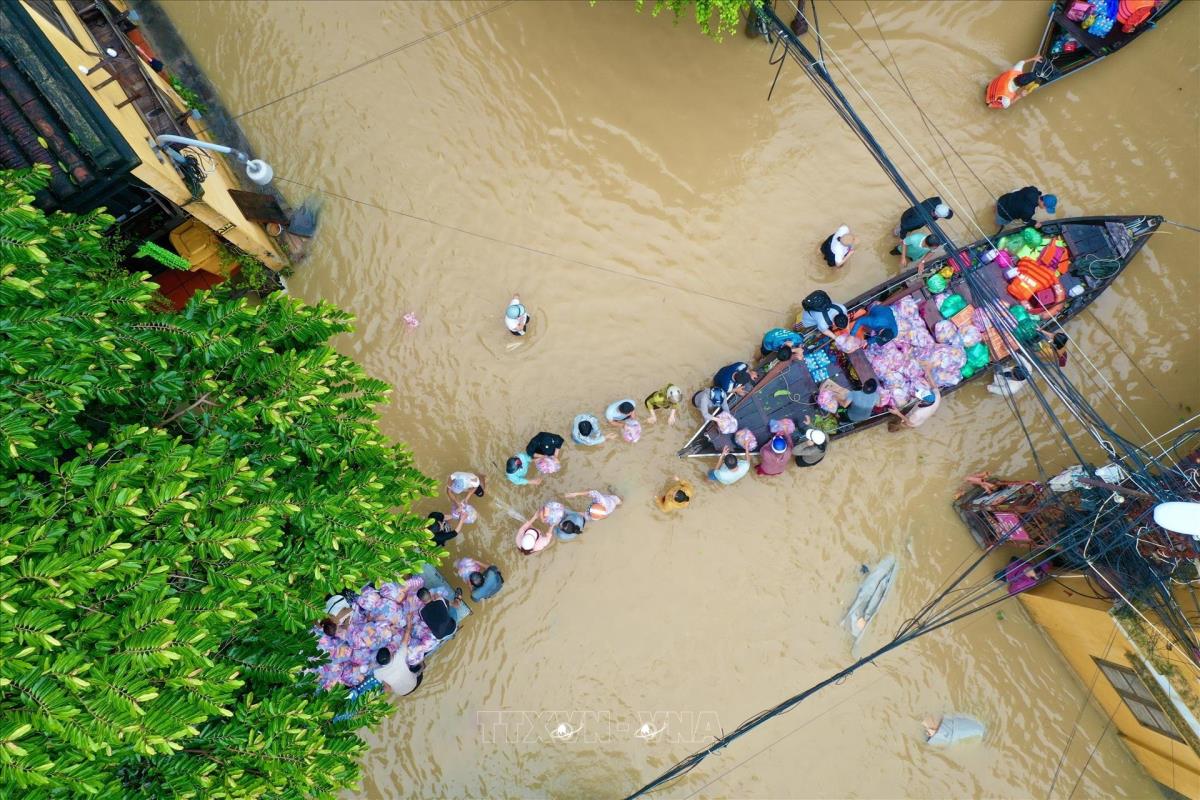 Các tuyến đường bộ lại trở thành đường thủy và người dân dùng ghe thuyền để vận chuyển hàng tiếp tế cho các gia đình trong phố cổ bị ngập nước (tháng 10/2025). Ảnh: Trần Lê Lâm - TTXVN
