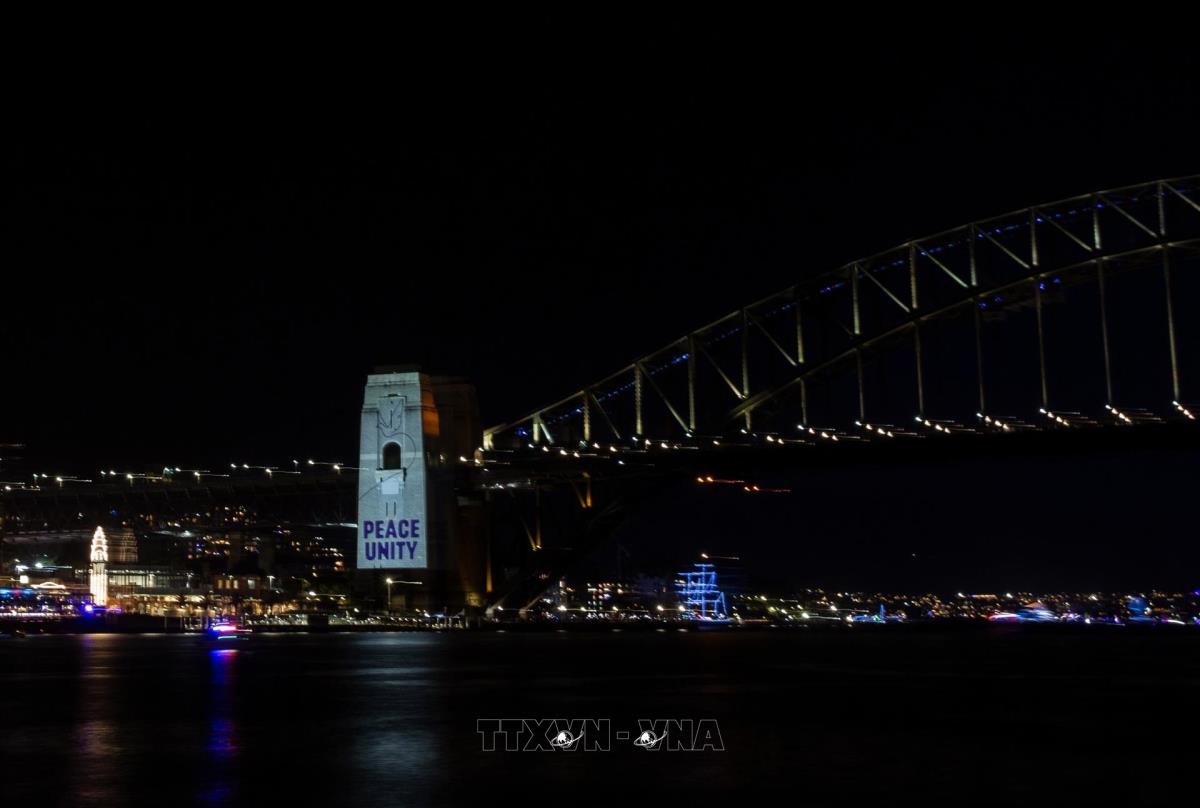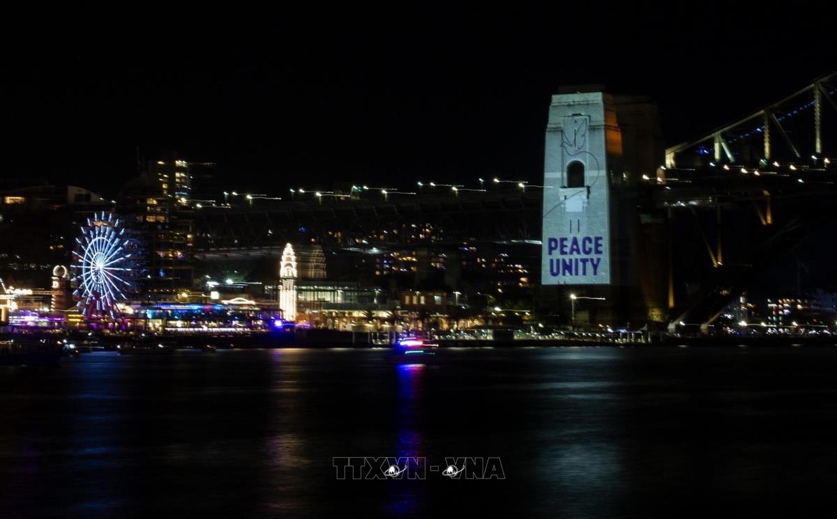 Cầu Cảng Sydney sáng rực màu trắng cùng biểu tượng một chú chim bồ câu trắng và dòng chữ "hòa bình, đoàn kết". Ảnh: THX/TTXVN