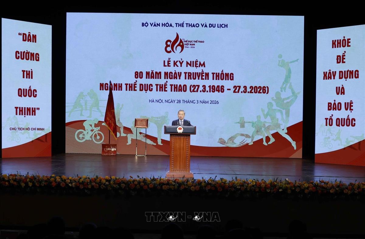 Hà Nội (TTXVN 28/3/2026) Sáng 28/3, tại Hà Nội, Bộ Văn hóa, Thể thao và Du lịch đã tổ chức Lễ kỷ niệm 80 năm Ngày truyền thống ngành thể dục thể thao (27/3/1946-27/3/2026). Đây là sự kiện có ý nghĩa sâu sắc đối với ngành thể dục thể thao, với sự nghiệp chăm sóc, bảo vệ con người, xây dựng đất nước Việt Nam cường thịnh, văn minh và phát triển bền vững. Tổng Bí thư Tô Lâm dự và phát biểu tại buổi Lễ.