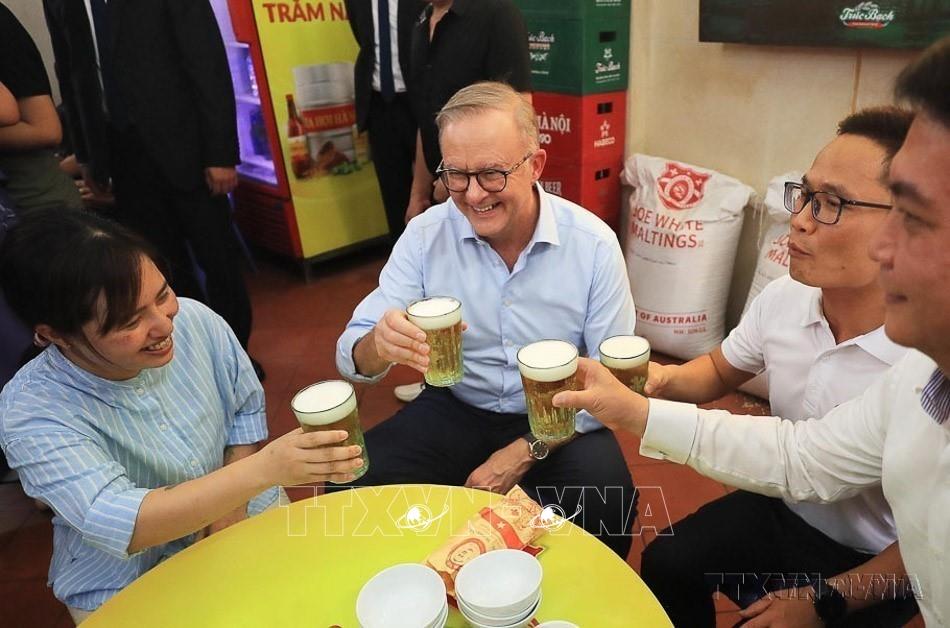 Ngoại giao đa phương là một điểm sáng trong hoạt động ngoại giao thời kỳ đổi mới, góp phần quan trọng củng cố và nâng cao vị thế quốc tế của đất nước, tạo ra thế cơ động linh hoạt trong quan hệ quốc tế, có lợi cho việc bảo vệ độc lập tự chủ và an ninh cũng như công cuộc xây dựng đất nước. Trong ảnh: Thủ tướng Australia Anthony Albanese thưởng thức món bánh mỳ patê truyền thống, uống bia hơi Hà Nội tại một quán ăn trên phố Đường Thành, quận Hoàn Kiếm, Hà Nội. Ảnh: Lâm Khánh - TTXVN