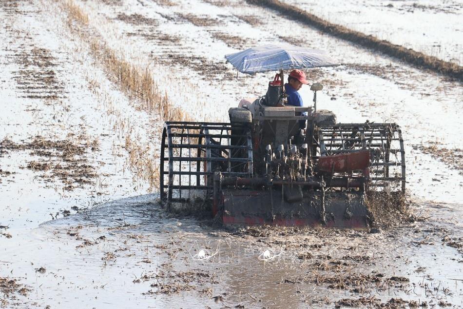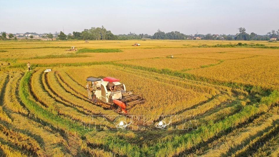 Thực hiện Chiến lược quốc gia về tăng trưởng xanh của Việt Nam, các biện pháp khuyến khích doanh nghiệp trong và ngoài nước tiếp cận và áp dụng mô hình nông nghiệp xanh, phát triển công nghiệp xanh. Trong ảnh: Cơ giới hóa 100 % khâu làm đất và thu hoạch lúa tại tỉnh Đồng Tháp. Ảnh: TTXVN