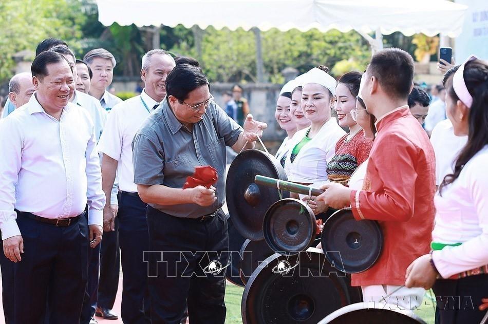 Thủ tướng Phạm Minh Chính với nhân dân vùng dự án cao tốc Hoà Bình - Mộc Châu tại Lễ khởi công xây dựng công trình cao tốc Hoà Bình - Mộc Châu (29/9/2024). Ảnh: Dương Giang-TTXVN