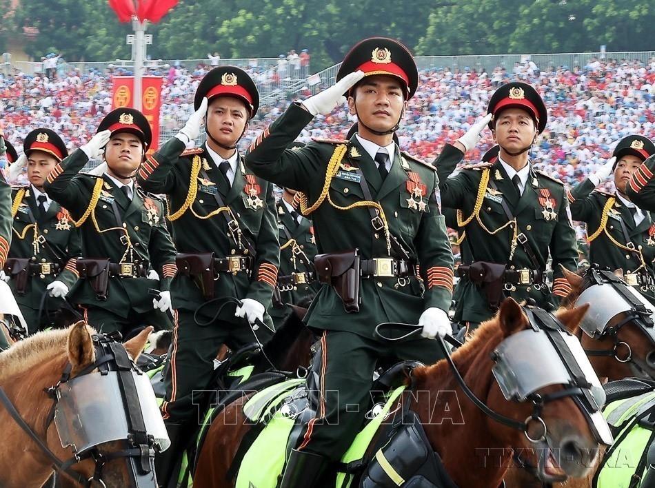 Quốc phòng, an ninh được Đảng ta xác định là nhiệm vụ “trọng yếu, thường xuyên” và luôn được coi trọng đẩy mạnh tổng kết thực tiễn, nghiên cứu phát triển lý luận để không ngừng bổ sung, hoàn thiện. Trong ảnh: Khối Cảnh sát cơ động Kỵ binh diễu binh trên Quảng trường Ba Đình trong Lễ kỷ niệm 80 năm Cách mạng tháng Tám thành công và Quốc khánh 2-9. Ảnh: Lâm Khánh-TTXVN