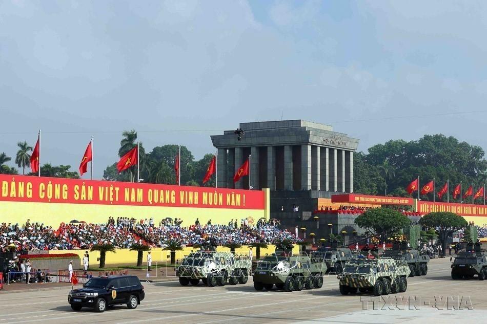 Quốc phòng, an ninh được Đảng ta xác định là nhiệm vụ “trọng yếu, thường xuyên” và luôn được coi trọng đẩy mạnh tổng kết thực tiễn, nghiên cứu phát triển lý luận để không ngừng bổ sung, hoàn thiện. Trong ảnh: Khối xe đặc chủng tác chiến dưới nước của lực lượng cảnh sát cơ động diễu binh trên Quảng trường Ba Đình trong Lễ kỷ niệm 80 năm Cách mạng tháng Tám thành công và Quốc khánh 2-9. Ảnh: Phạm Kiên - TTXVN