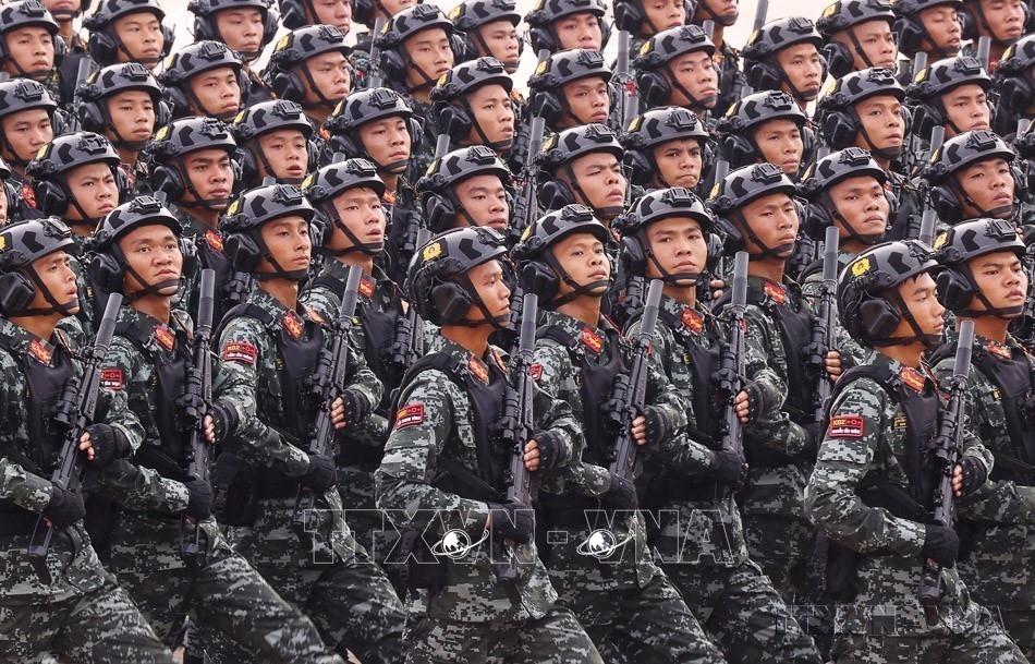 Quốc phòng, an ninh được Đảng ta xác định là nhiệm vụ “trọng yếu, thường xuyên” và luôn được coi trọng đẩy mạnh tổng kết thực tiễn, nghiên cứu phát triển lý luận để không ngừng bổ sung, hoàn thiện. Trong ảnh: Khối nam chiến sĩ Cảnh sát đặc nhiệm diễu binh trên Quảng trường Ba Đình trong Lễ kỷ niệm 80 năm Cách mạng tháng Tám thành công và Quốc khánh 2/9. Ảnh: Văn Điệp - TTXVN