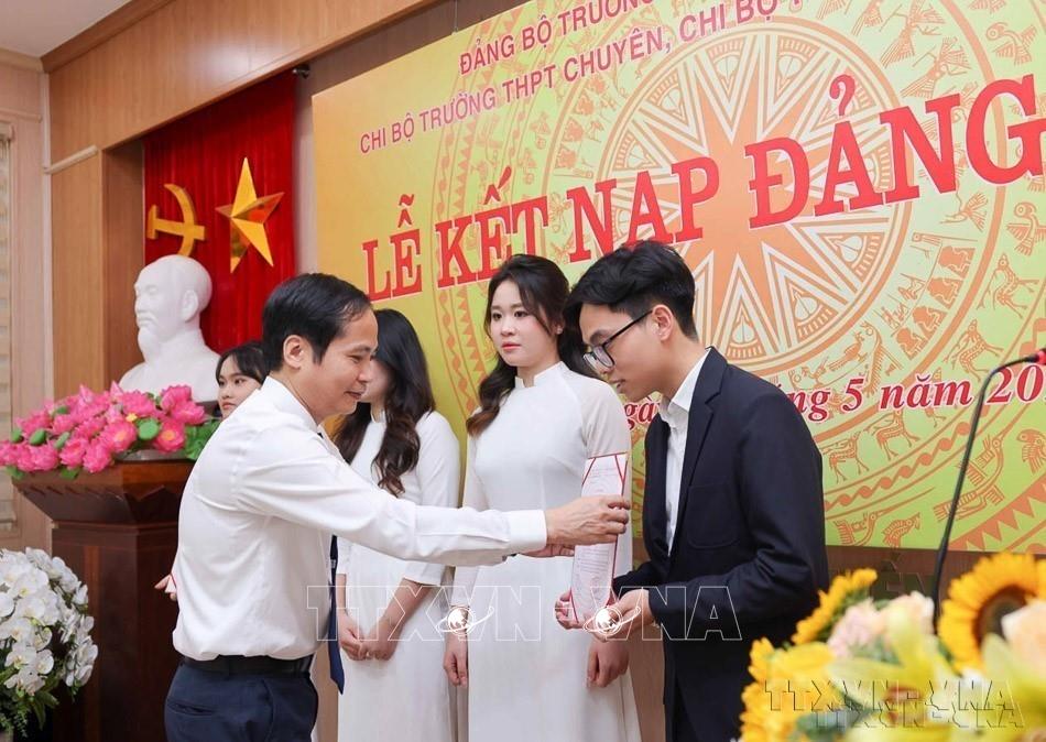 Công tác xây dựng Đảng về tư tưởng tiếp tục được đổi mới mạnh mẽ, đi vào chiều sâu, góp phần nâng cao nhận thức, tăng cường đoàn kết, thống nhất trong Đảng và hệ thống chính trị. Trong ảnh: Chi bộ trường THPT Chuyên và Chi bộ trường Nguyễn Tất Thành thuộc Đảng bộ trường đại học Sư phạm Hà Nội tổ chức lễ kết nạp Đảng cho 8 quần chúng ưu tú là học sinh của hai trường. Ảnh: Thanh Tùng - TTXVN