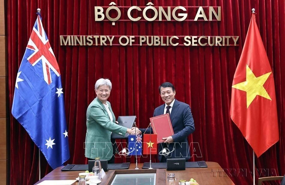 Quốc phòng, an ninh được Đảng ta xác định là nhiệm vụ “trọng yếu, thường xuyên” và luôn được coi trọng đẩy mạnh tổng kết thực tiễn, nghiên cứu phát triển lý luận để không ngừng bổ sung, hoàn thiện. Trong ảnh: Đại Tướng Lương Tam Quang, Bộ trưởng Bộ Công an và Bộ trưởng Ngoại giao Australia Penny Wong ký Bản ghi nhớ “Hợp tác về các vấn đề mạng và công nghệ trọng yếu” (Hà Nội, 20/08/2025). Ảnh: Phạm Kiên -TTXVN