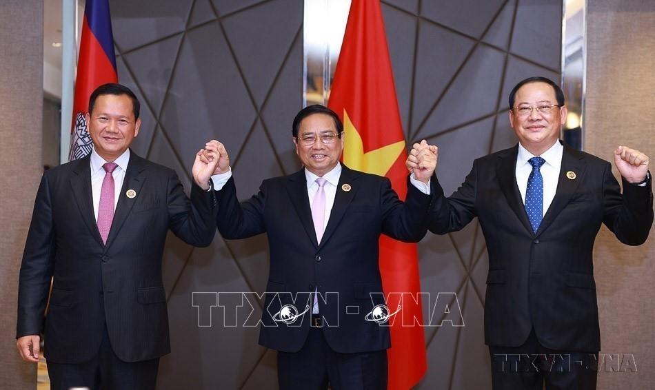 Nhân chuyến tham dự Hội nghị Cấp cao ASEAN lần thứ 46 và các hội nghị cấp cao liên quan tại Kuala Lumpur, Malaysia, sáng 26/5/2025, Thủ tướng Phạm Minh Chính cùng Thủ tướng Lào Sonexay Siphandone và Thủ tướng Campuchia Hun Manet ăn sáng và làm việc. Ảnh: Dương Giang-TTXVN