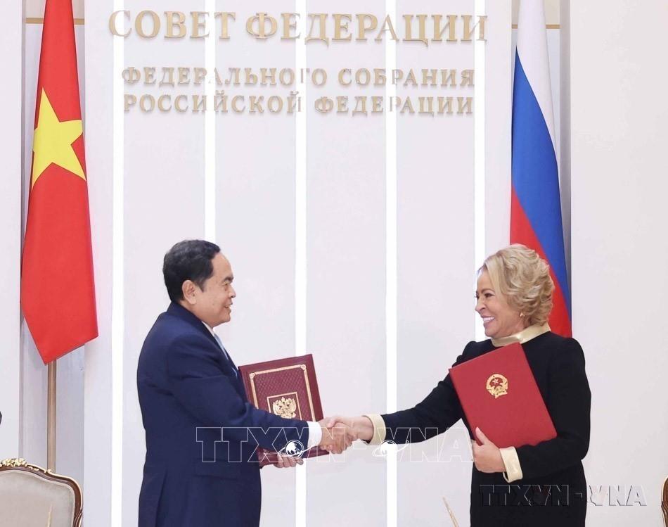 Chủ tịch Quốc hội Trần Thanh Mẫn và Chủ tịch Hội đồng Liên bang, Quốc hội Liên bang Nga Valentina Ivanovna Matvienko ký thoả thuận hợp tác giữa Quốc hội Việt Nam và Hội đồng Liên bang, Quốc hội Liên bang Nga (Moskv, 9/9/2024). Ảnh: Thống Nhất-TTXVN