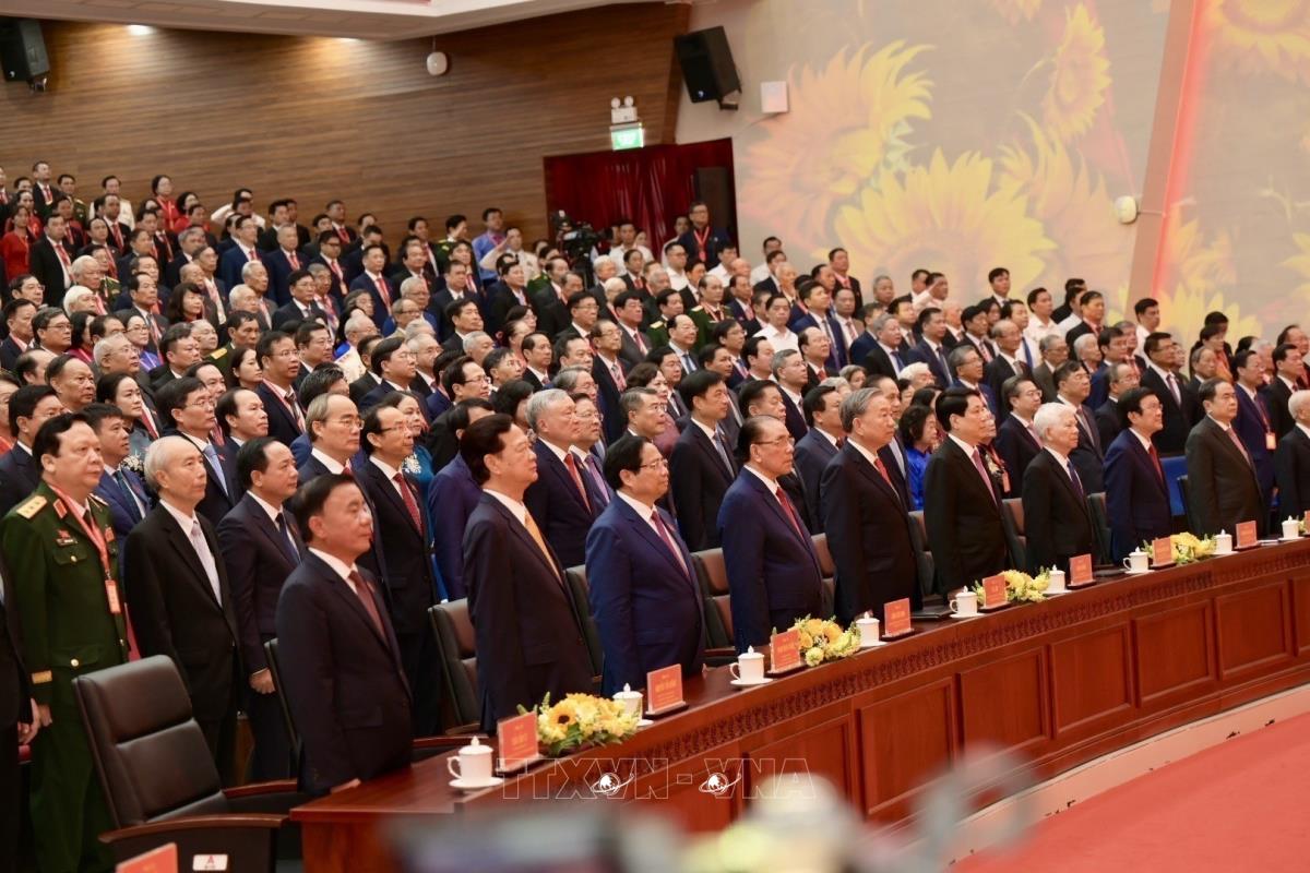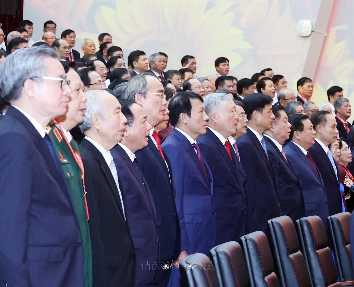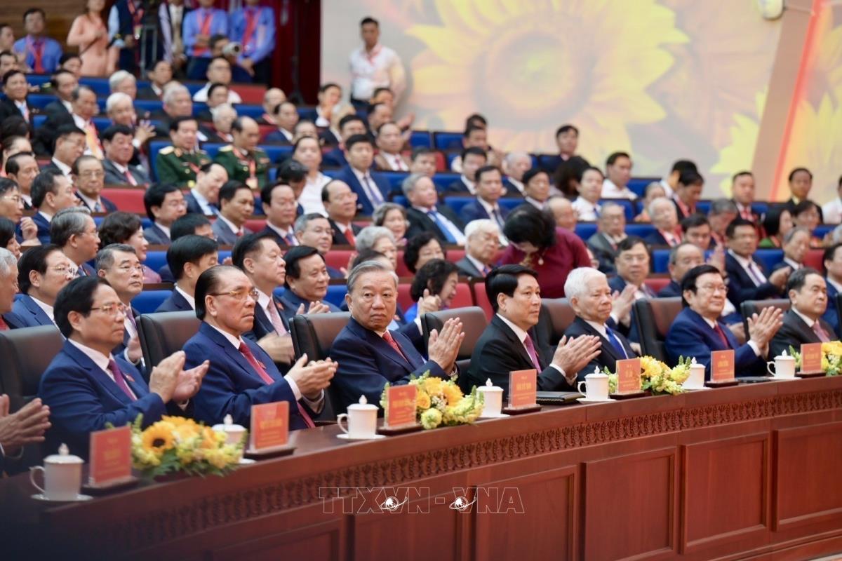 Tổng Bí thư Tô Lâm cùng các đồng chí lãnh đạo, nguyên lãnh đạo Đảng, Nhà nước tham dự Đại hội (14/10/2025). Ảnh: Thanh Vũ-TTXVN