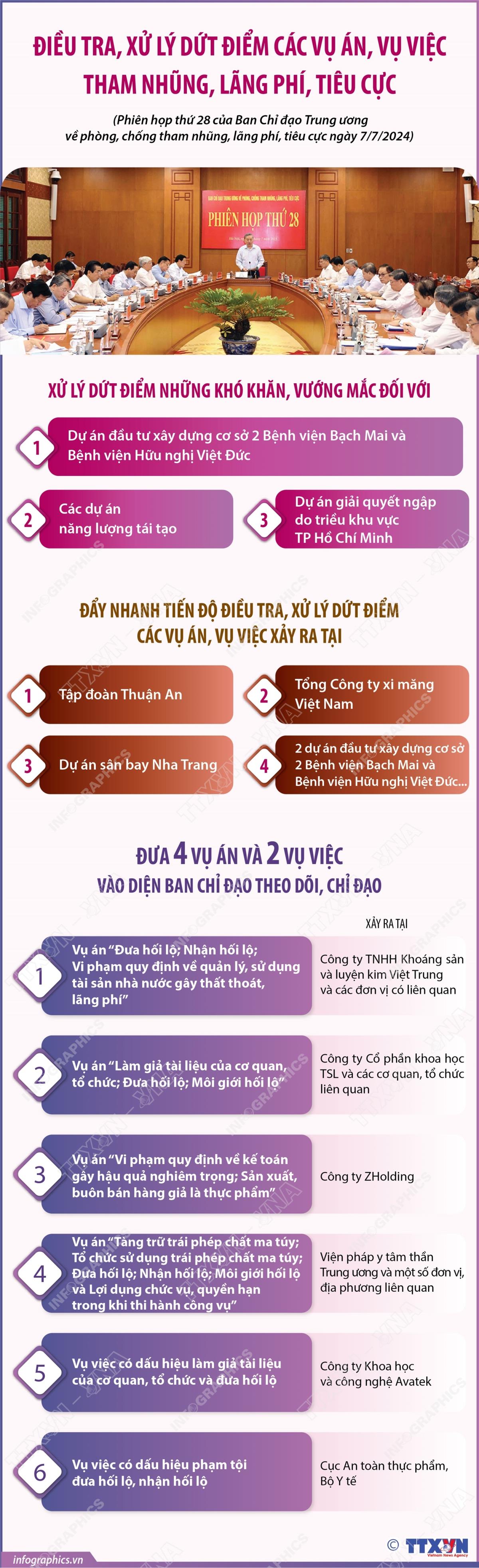 Tại Phiên họp này, Tổng Bí thư đề nghị đẩy nhanh tiến độ điều tra, xử lý dứt điểm các vụ án, vụ việc xảy ra tại tập đoàn Thuận An, Tổng Công ty xi măng Việt Nam, dự án sân bay Nha Trang, 2 dự án đầu tư xây dựng cơ sở 2 Bệnh viện Bạch Mai và Bệnh viện Hữu nghị Việt Đức... Ban Chỉ đạo thống nhất đưa 4 vụ án và 2 vụ việc vào diện Ban Chỉ đạo theo dõi, chỉ đạo.