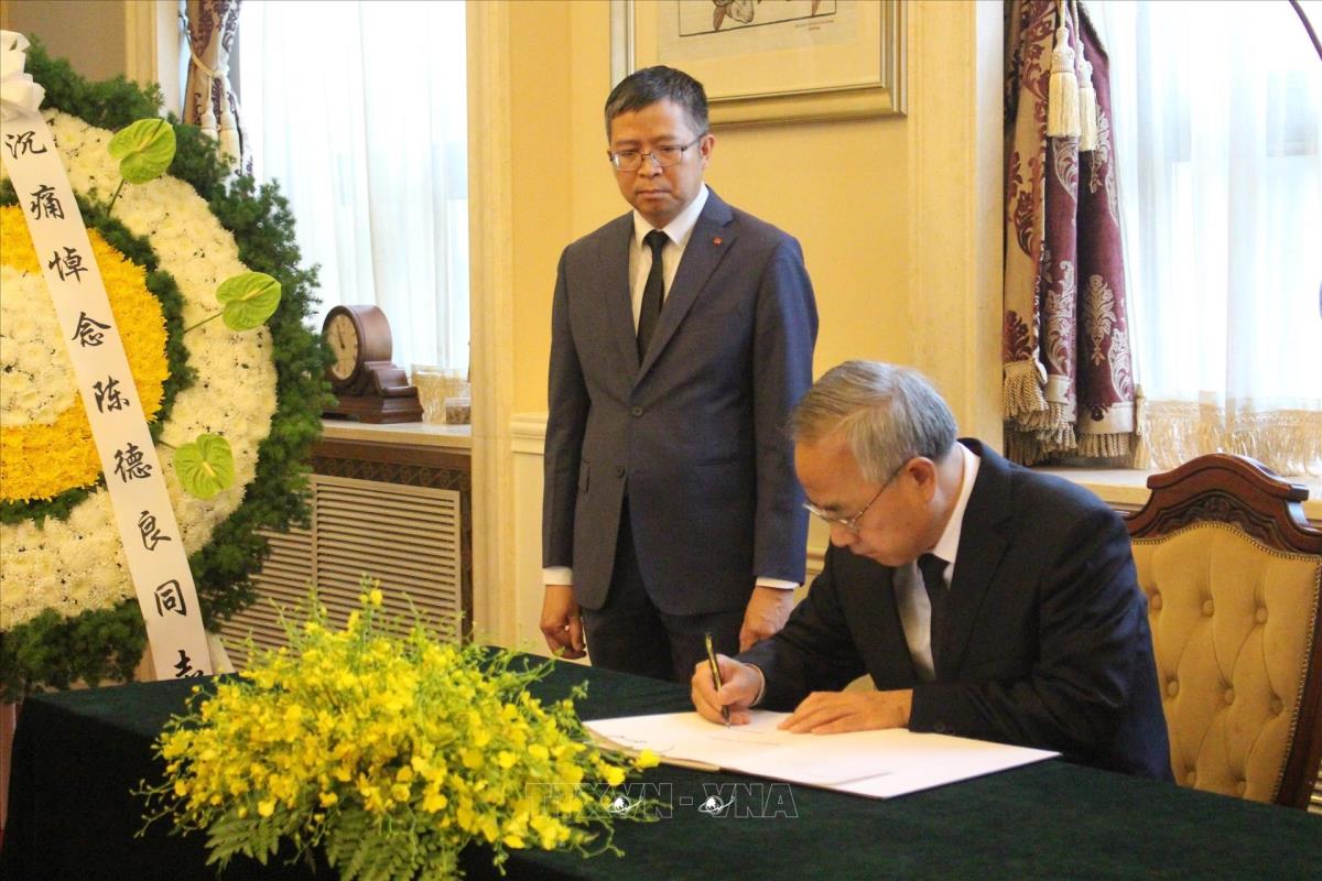 Đồng chí Hồ Xuân Hoa, Phó Chủ tịch Chính hiệp toàn quốc Trung Quốc ghi sổ tang nguyên Chủ tịch nước Trần Đức Lương (25/5/2025). Ảnh: Hải Yến - PV TTXVN tại Trung Quốc
