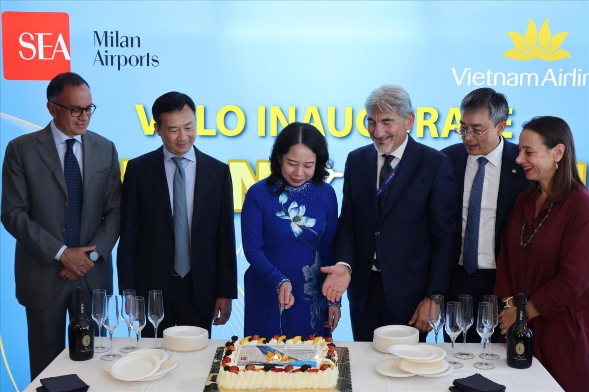 Phó Chủ tịch nước Võ Thị Ánh Xuân cắt bánh khai trương đường bay thẳng đầu tiên kết nối Thủ đô Hà Nội với thành phố Milan (Italy, 1/7/2025). Ảnh: Trường Dụy-TTXVN