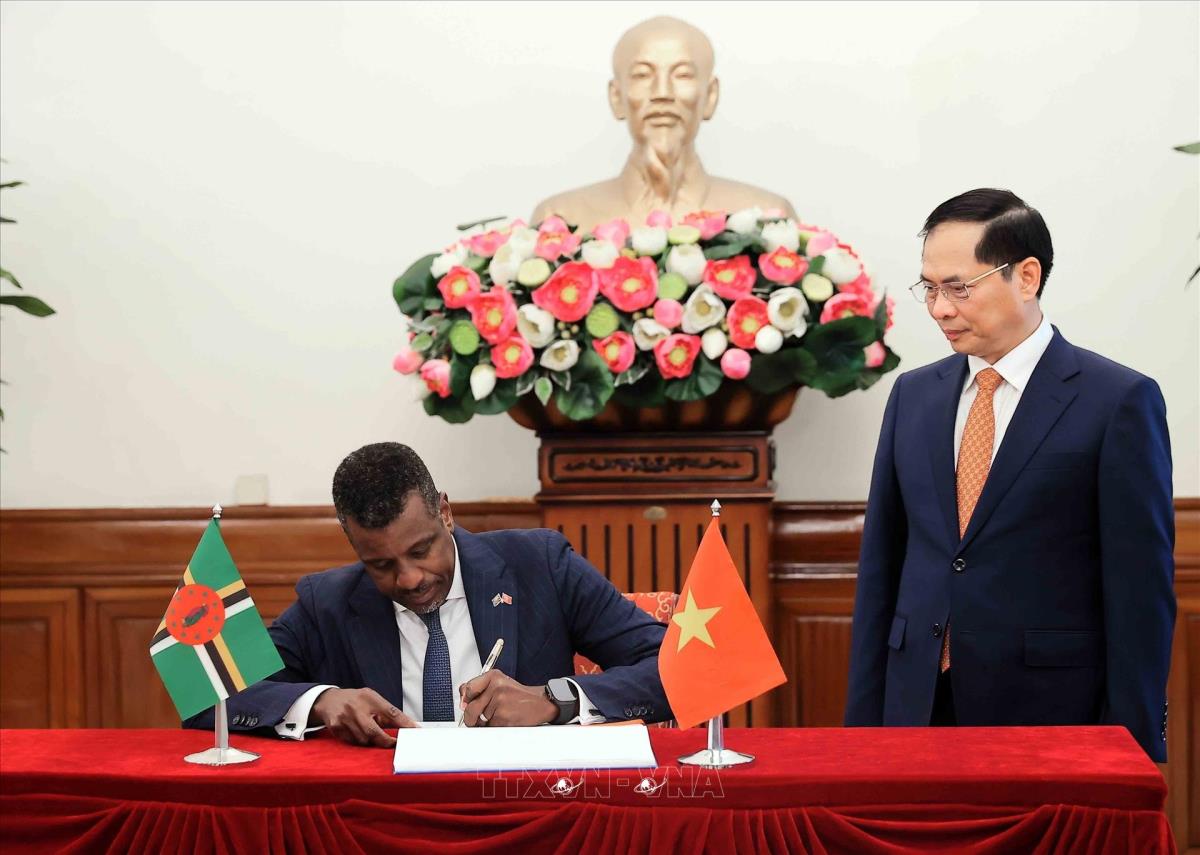 Phó Thủ tướng, Bộ trưởng Bộ Ngoại giao Bùi Thanh Sơn đón Bộ trưởng Ngoại giao, Ngoại thương, Thương mại và Năng lượng Cộng đồng Thịnh vượng Dominica Vince Henderson (28/5/2025). Ảnh: An Đăng - TTXVN