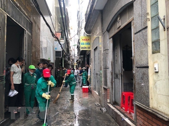 Lực lượng chức năng quận Thanh Xuân dọn dẹp vệ sinh trước chung cư mi ni xảy ra vụ cháy khiến nhiều người thương vong trên phố Khương Hạ. (Ảnh: TTXVN phát)