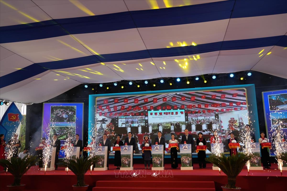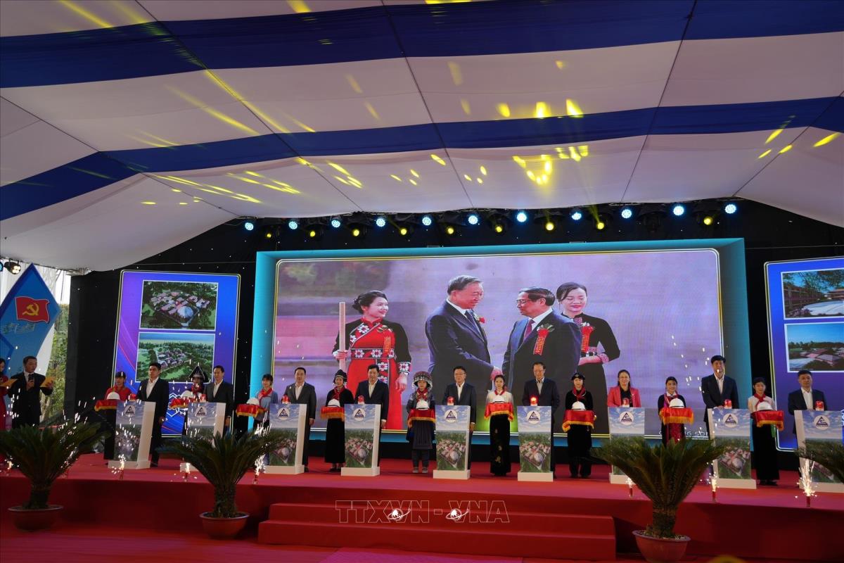 Phó Thủ tướng Lê Thành Long cùng lãnh đạo tỉnh Lào Cai bấm nút khởi công, động thổ công trình (19/3/2026). Ảnh: Hồng Ninh- TTXVN